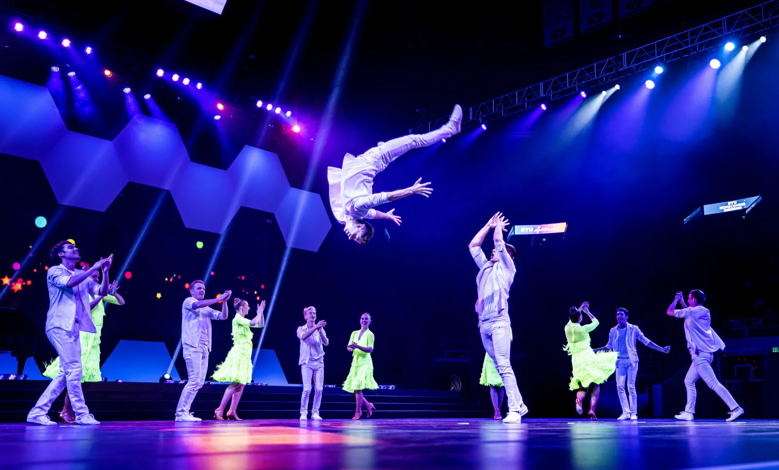 BYU Ballroom student performs a backflip during the homecoming spectacular event.