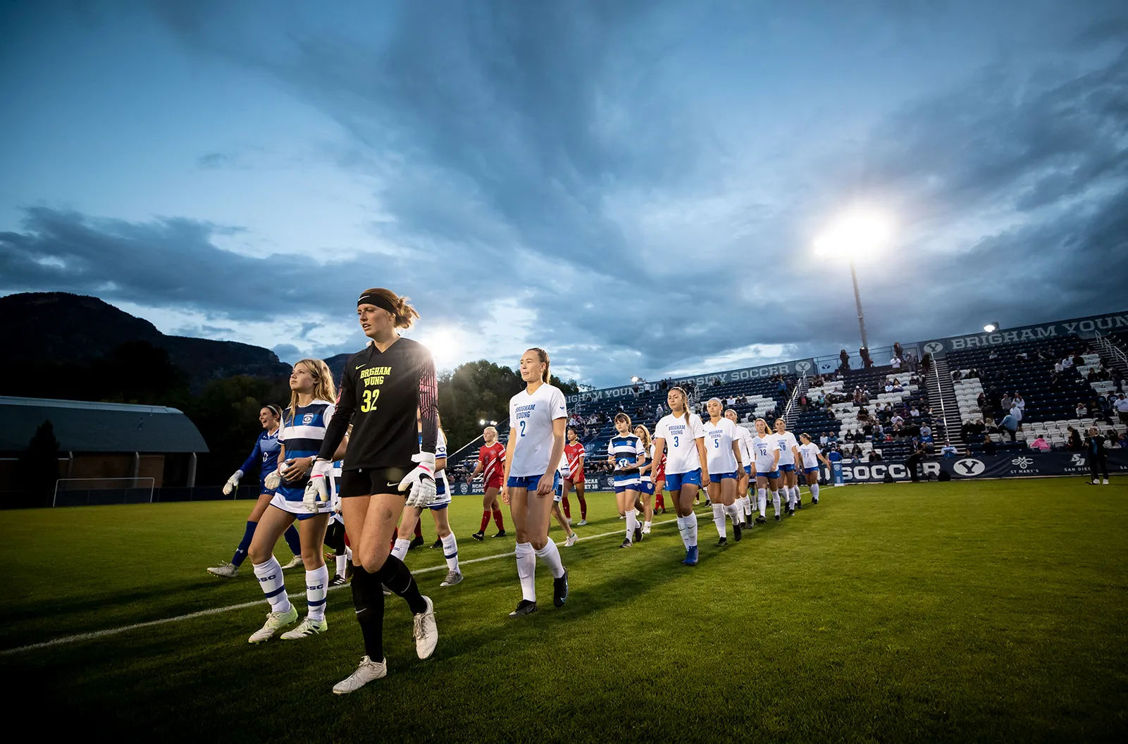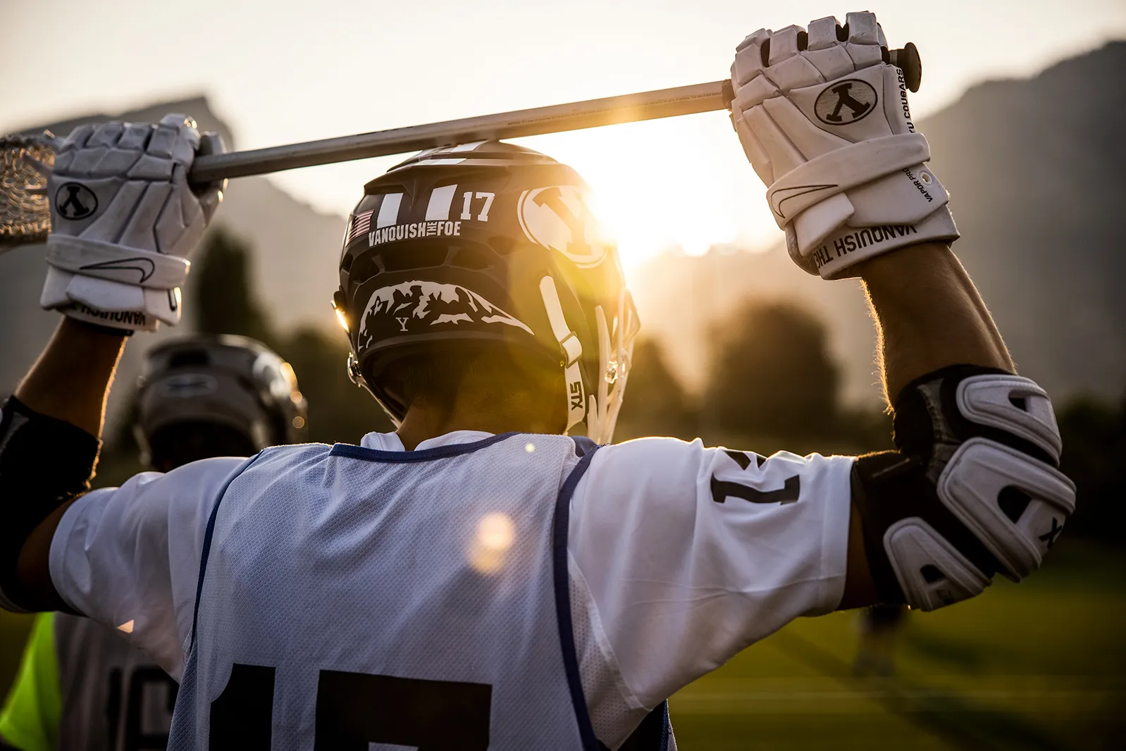 LAX player stretches on the sideline during a morning scrimmage. Over his shoulder, you can see the beautiful sunrise over the Wasatch front.