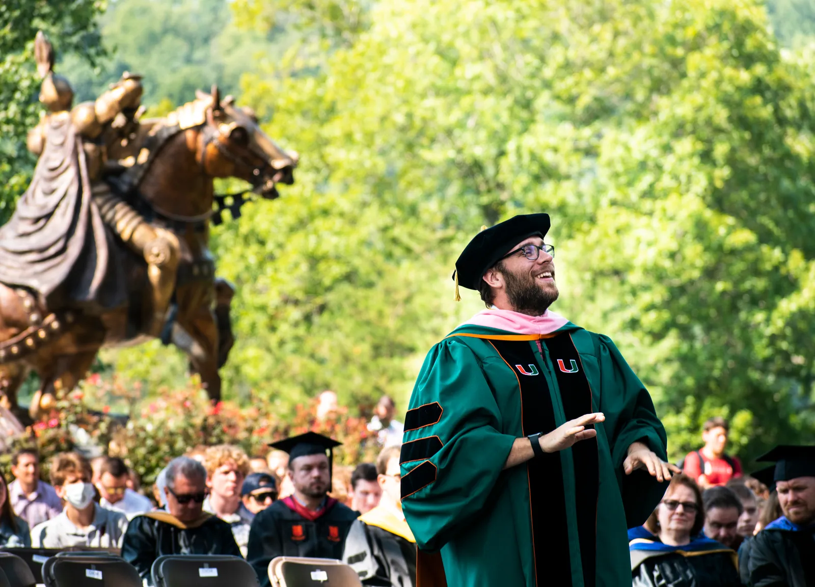 Professor Nielsen, in full academic regalia, leads the chamber singers in "Shenandoah" at Southern Virginia University's first meeting of the 2021 academic year.