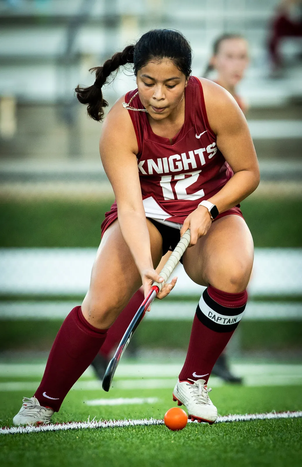 The team captain of Southern Virginia University's Women's field hockey, Elizabeth Sorto, makes a play on the ball during their game against Bridgewater College.