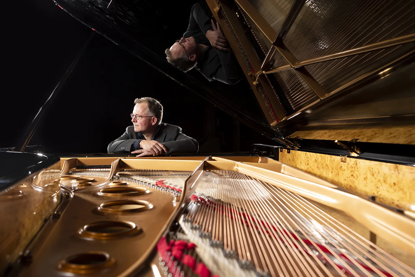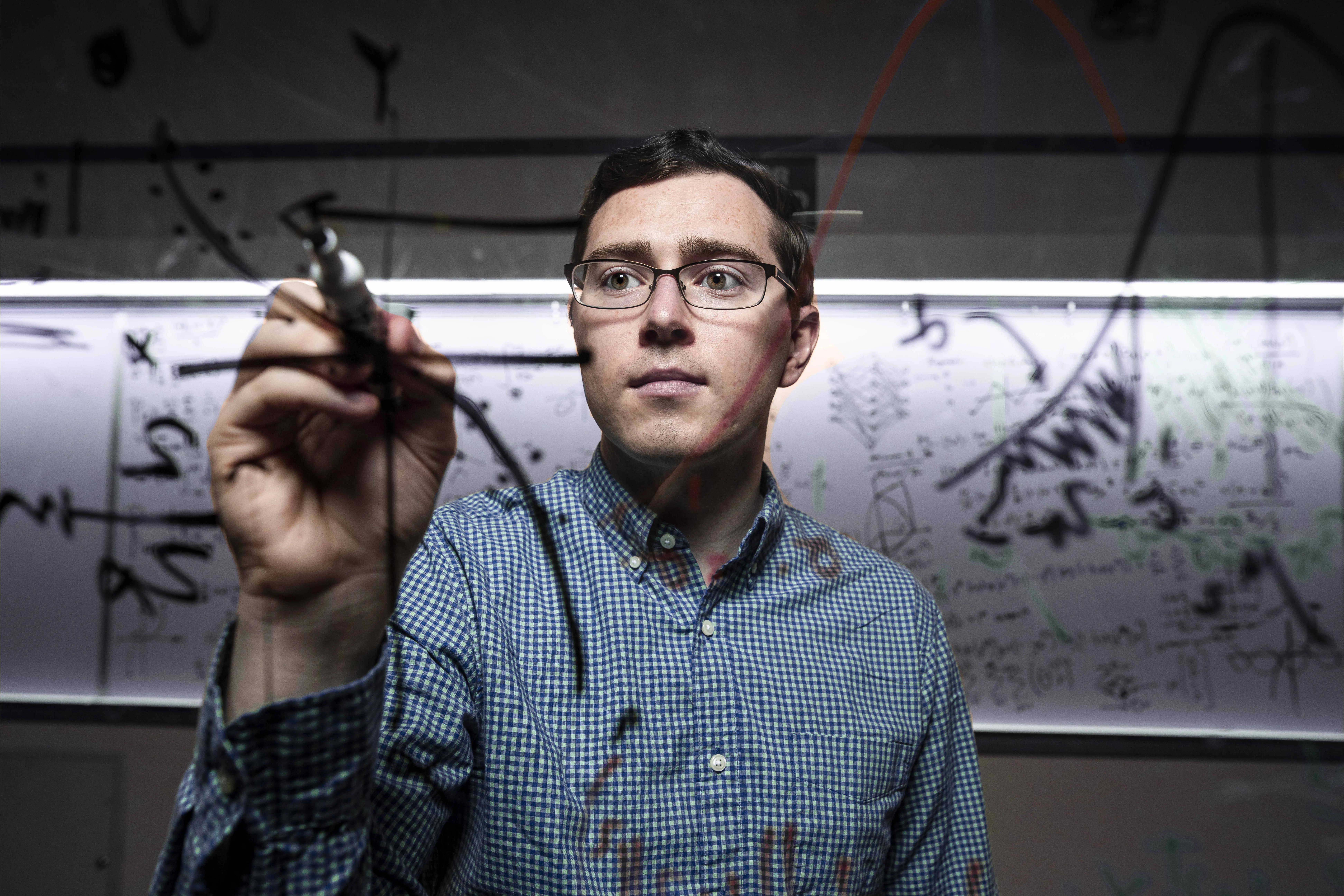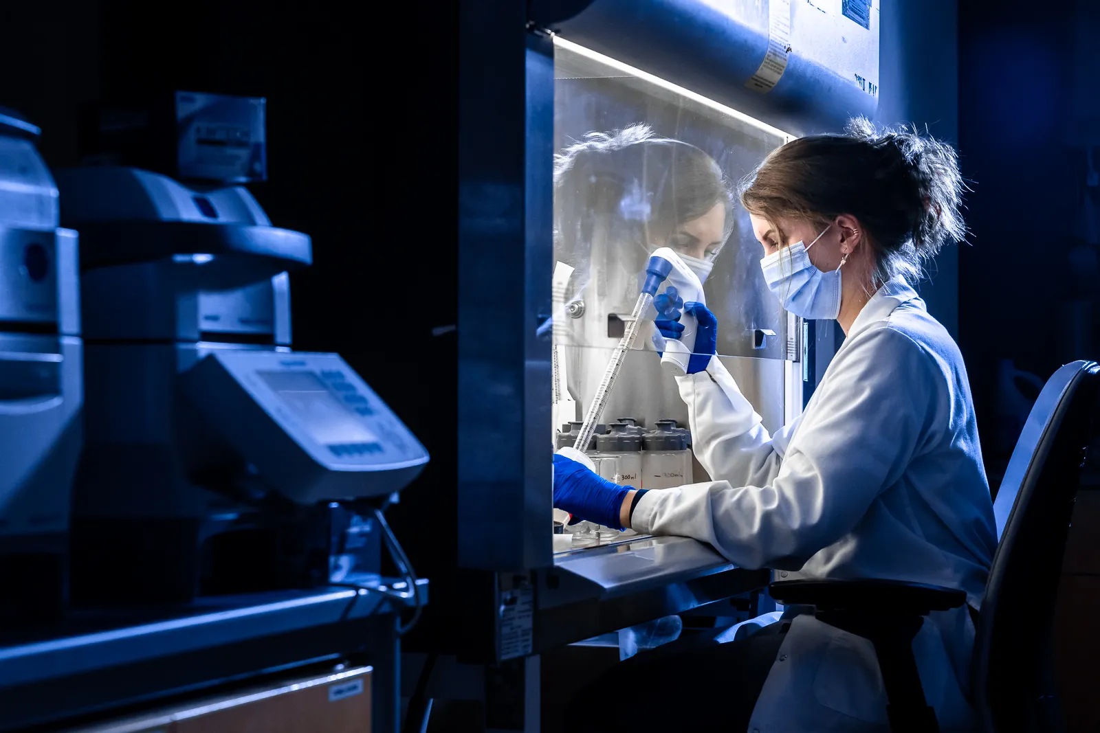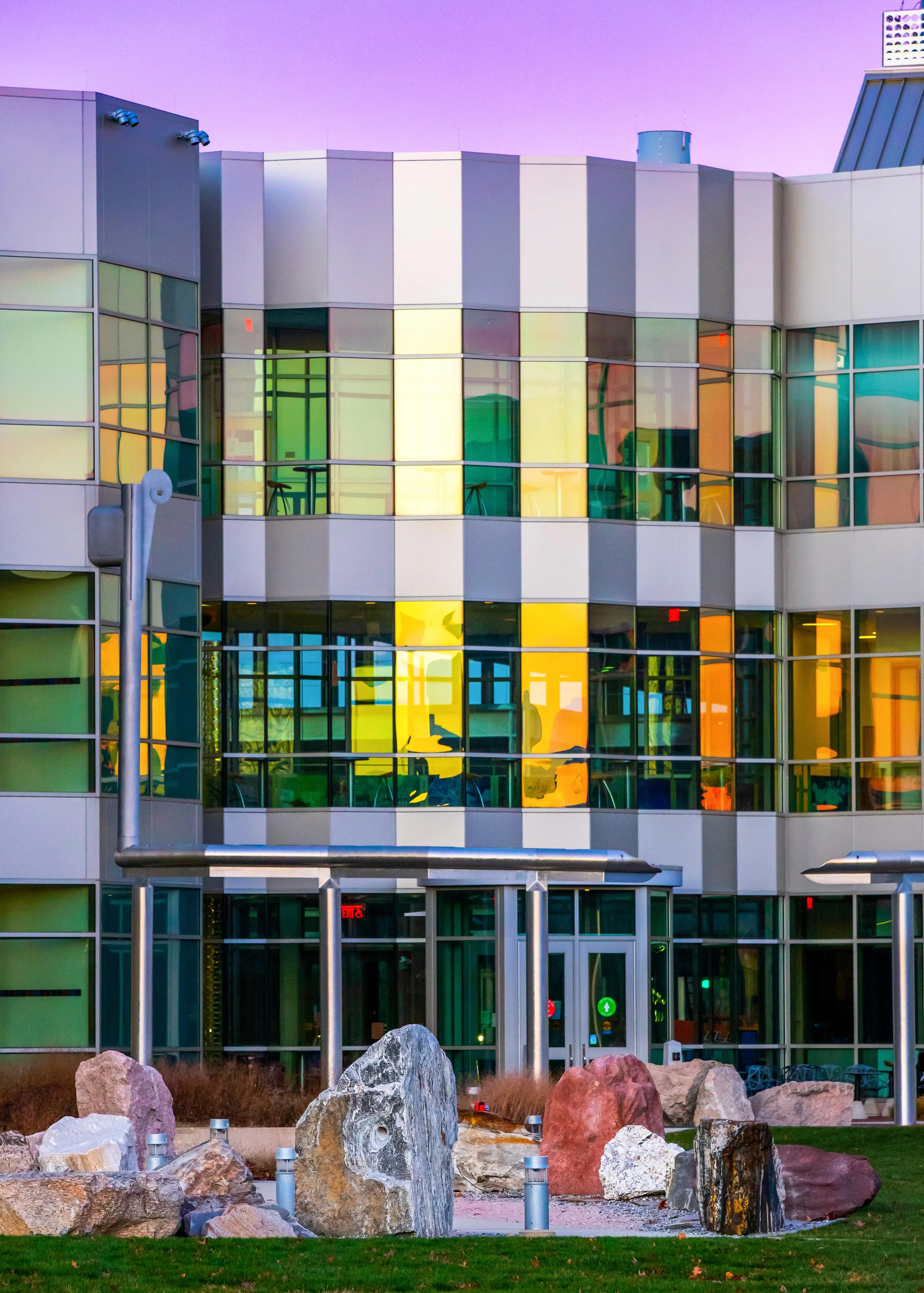 A scattered, autumn sunset shines on the academic science building on campus, revealing a lilac afterglow in the twilight sky.
