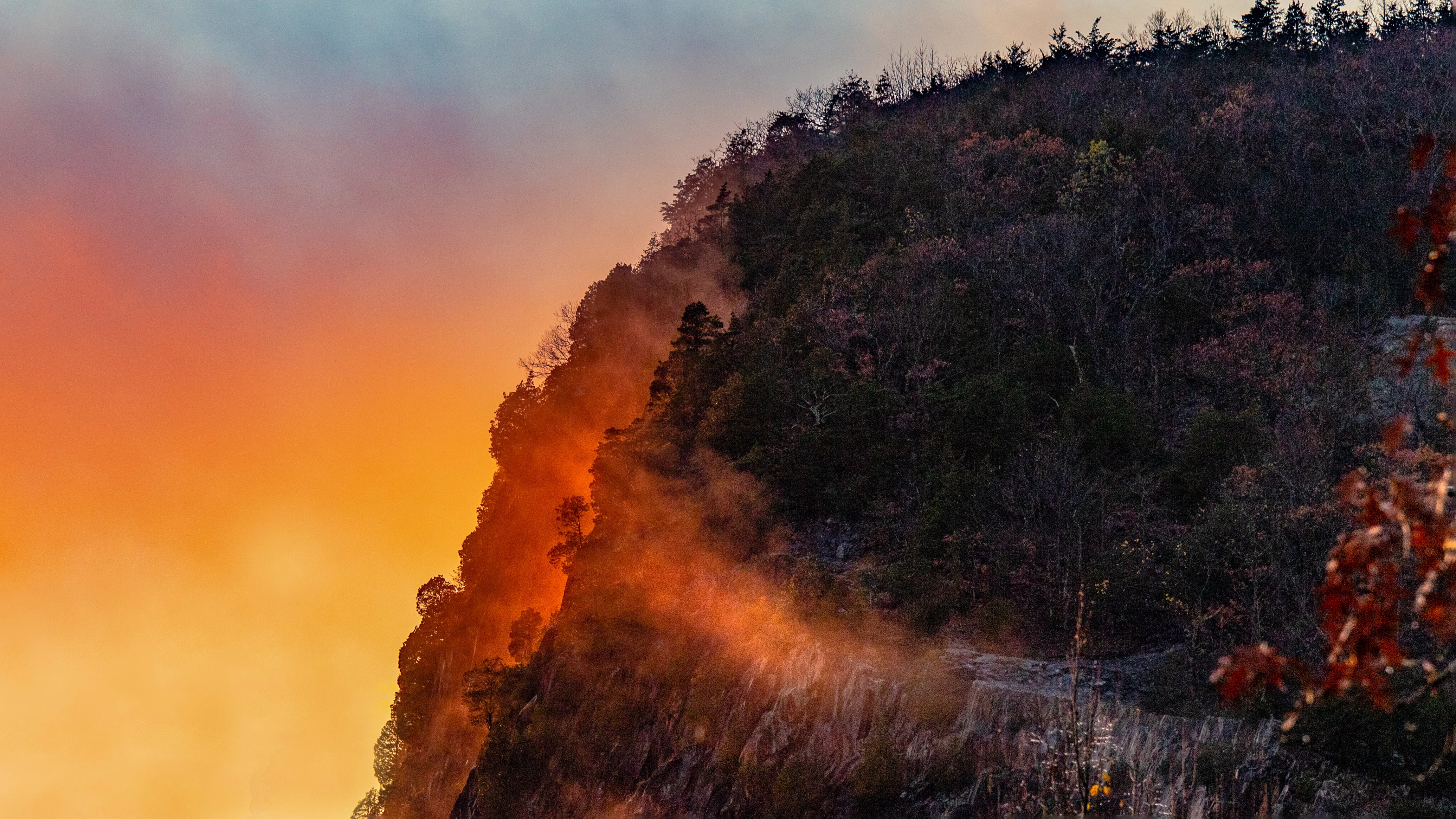 A dramatic sunset over West Rock, giving the illusion of the cliff ablaze