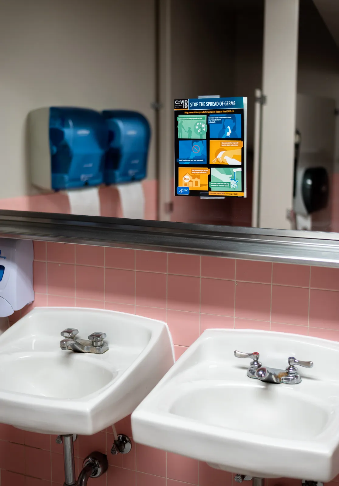 Friendly reminders posted in campus bathrooms to slow the spread of COVID-19
