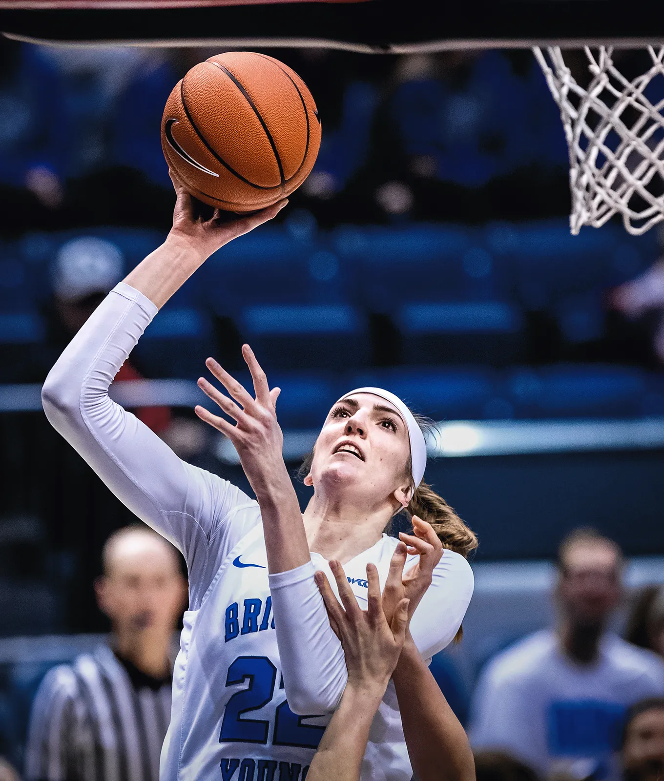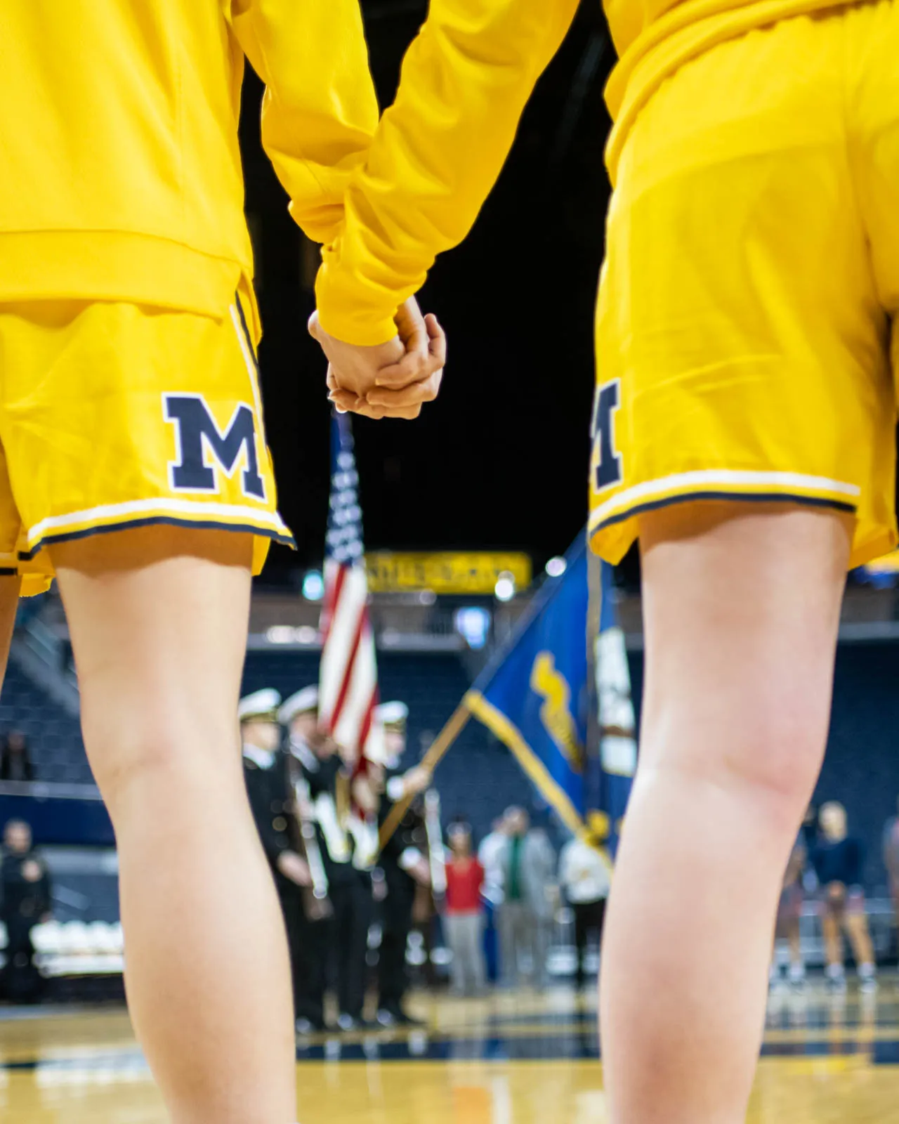 Two University of Michigan women's basketball players form an "M" with a handhold to match the revered university "Block M" emblem on their shorts as they honor our nation during the presentation of the colors at Crisler Center in Ann Arbor, Michigan.