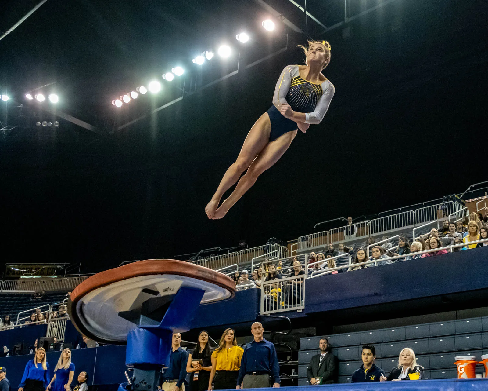 The lights of Crisler Center shine down on University of Michigan women's gymnast Maddie Mariani as she takes flight during the vault competition at the Michigan Quad Exhibition meet in Ann Arbor, Michigan.