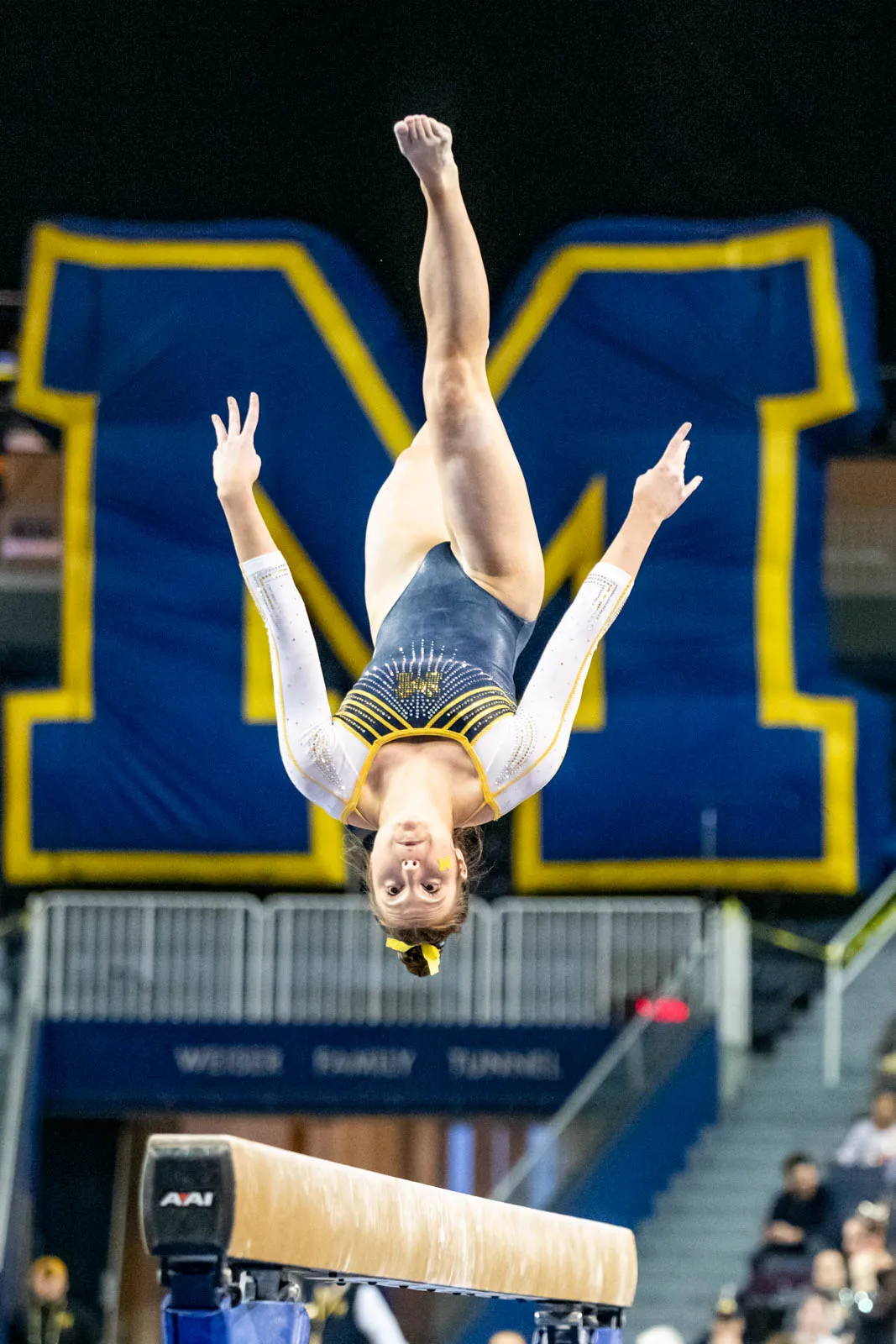 The revered Michigan "Block M" provides the perfect backdrop as University of Michigan gymnast Maddie Mariani performs a tumbling pass on the balance beam during the Michigan Quad Exhibition Meet at Crisler Center in Ann Arbor, Michigan.