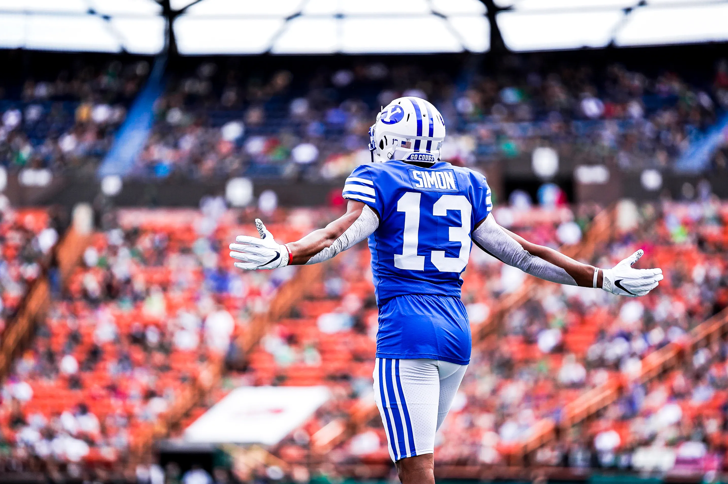 After scoring a touchdown BYU player soaks in the moment of the crowd before he celebrates with his teammates.