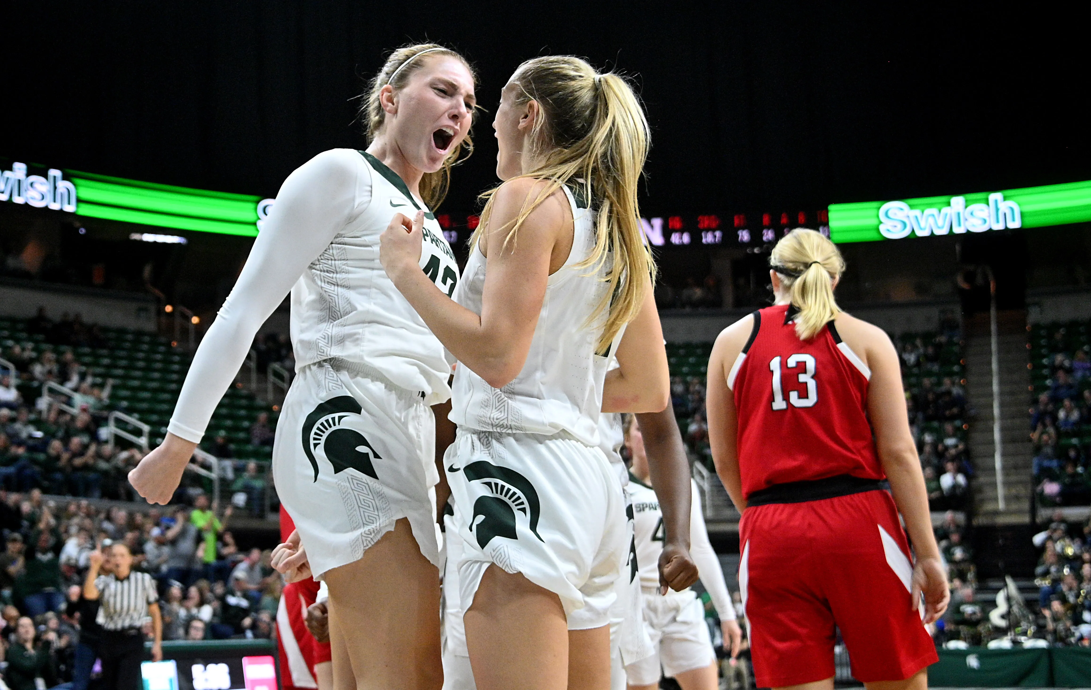 Michigan State University players celebrate under the basket as the Spartans upset 11-1 Nebraska on New Years Eve at Breslin Center in East Lansing. Referees gave the Spartans a basket and a foul on the play.