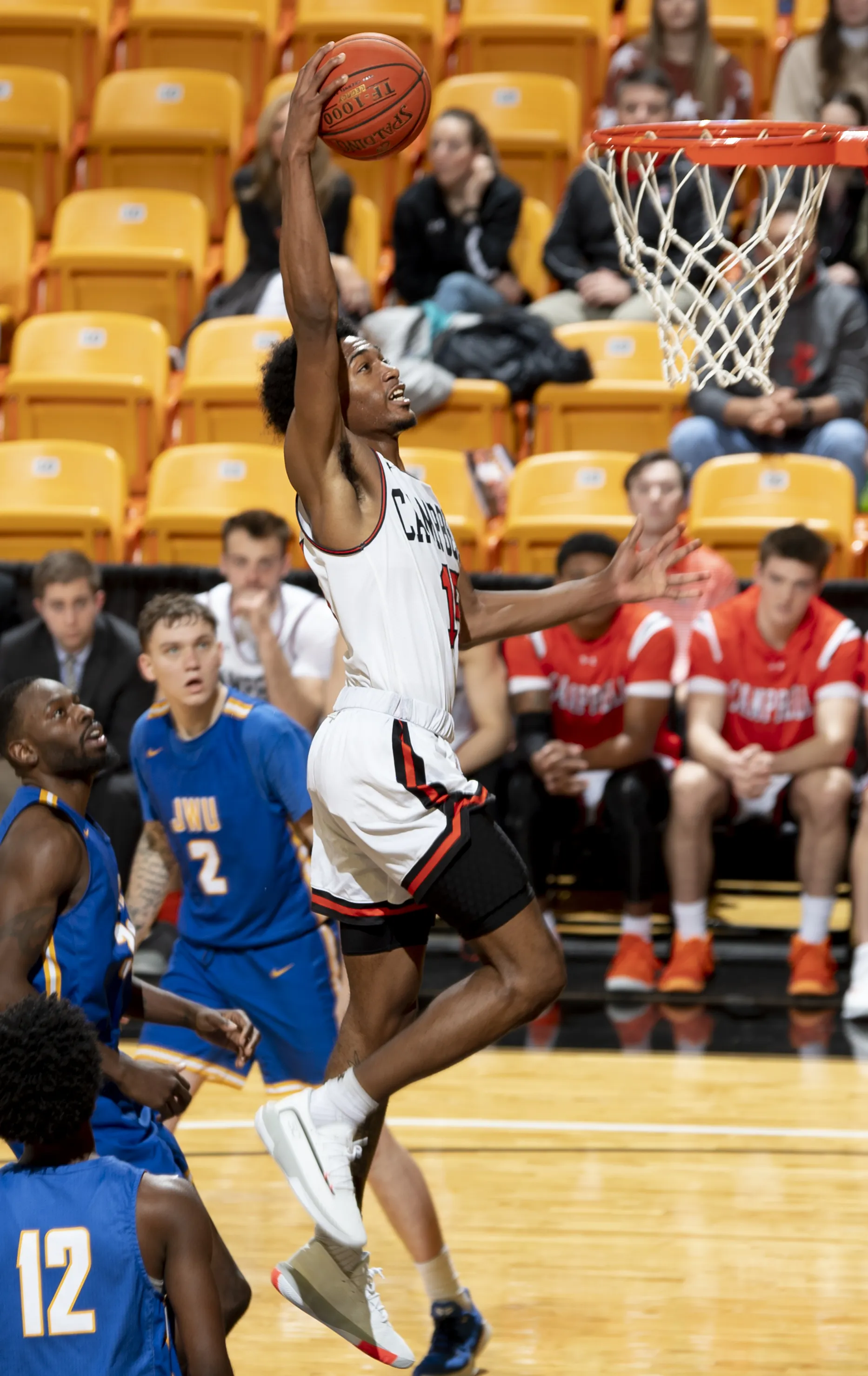 Campbell University’s redshirt freshman Ladarius Knight dunks the ball late in the second half of the game.