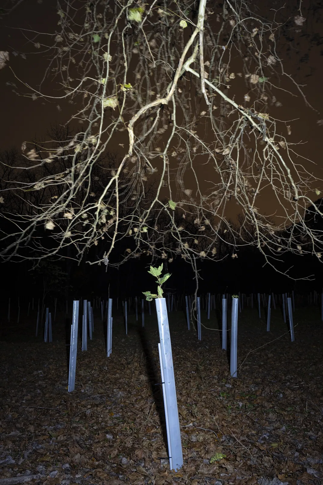 In a landscape that was once home to dense, continuous woodlands, invasive plants have taken over. Decades of struggle to maintain a healthy and diverse ecosystem have led to an effort to restore and reforest original habitats. The invasive plants are cleared. In their place, young native trees are planted, protected by a white protective sleeve. These efforts, beyond the obvious benefits of restoration, serve another purpose.