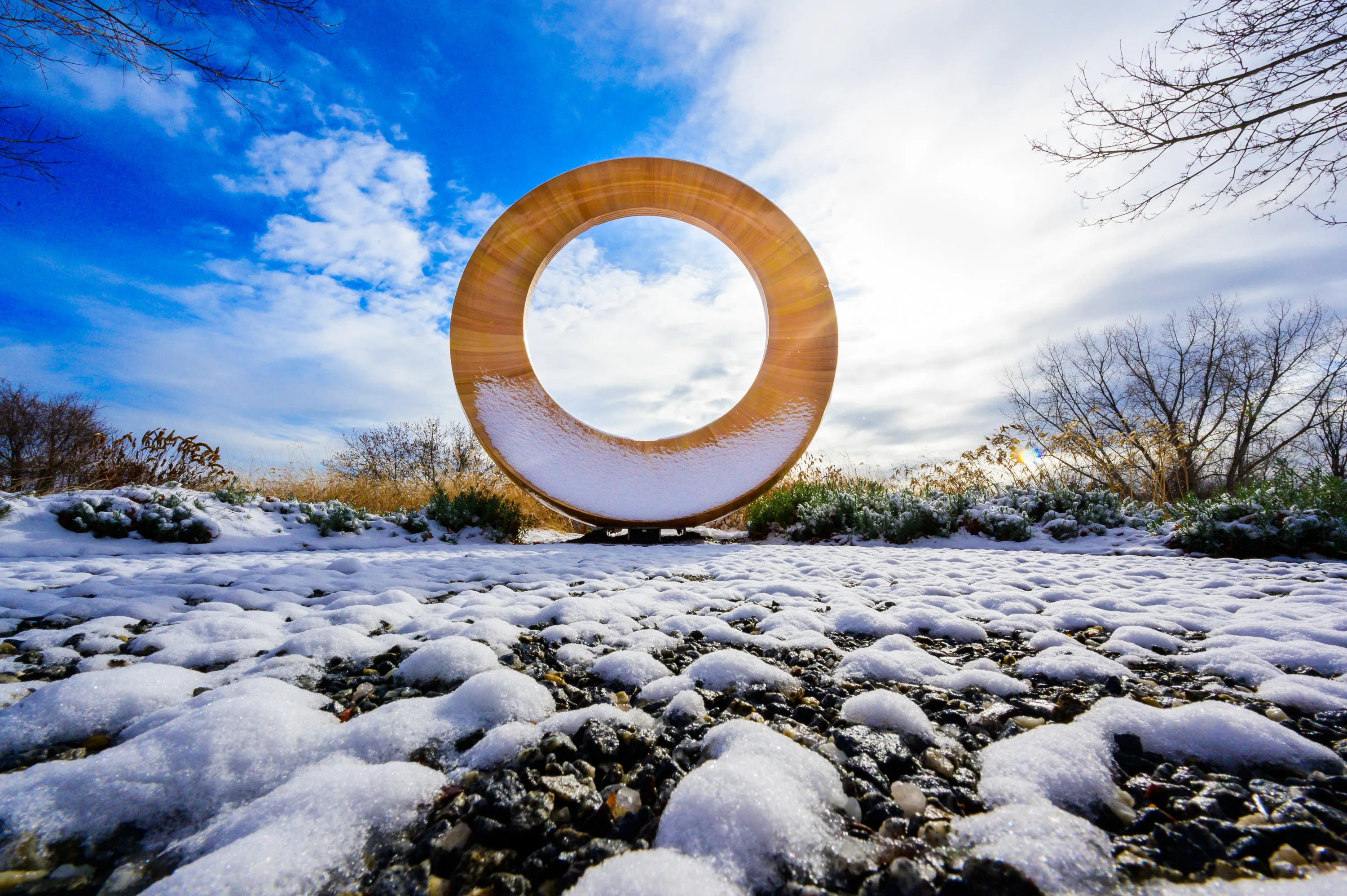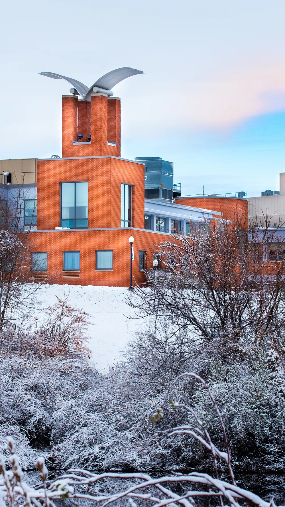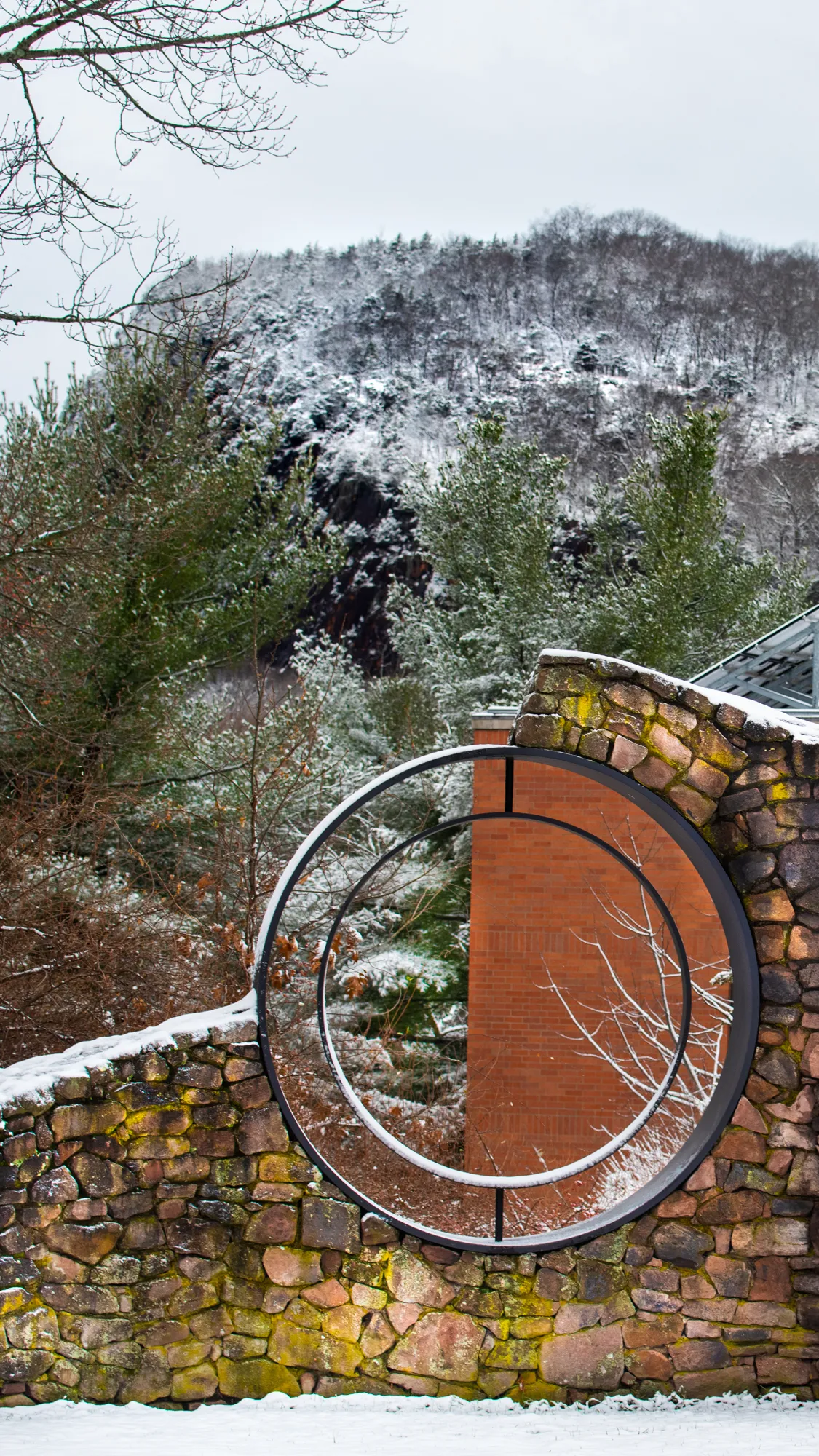 A sculpture at Southern Connecticut State University with a snowy view of West Rock in New Haven