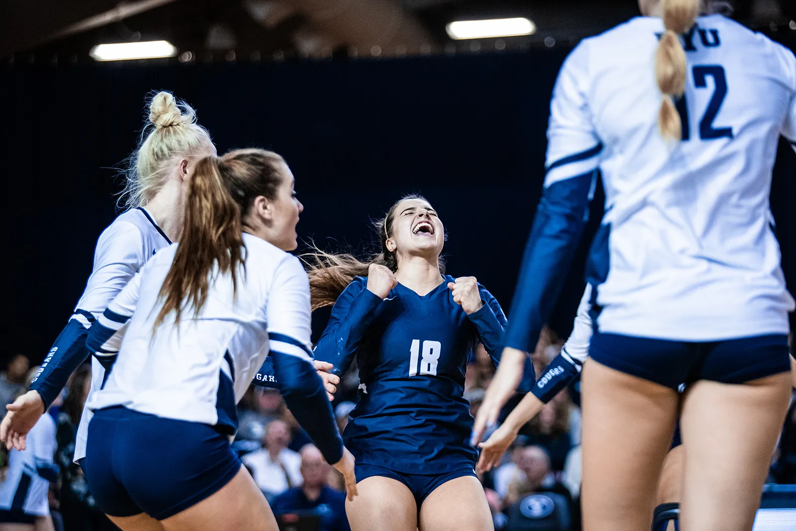 Libero Mary Lake jumps for joy during the women's volleyball game vs Pepperdine.