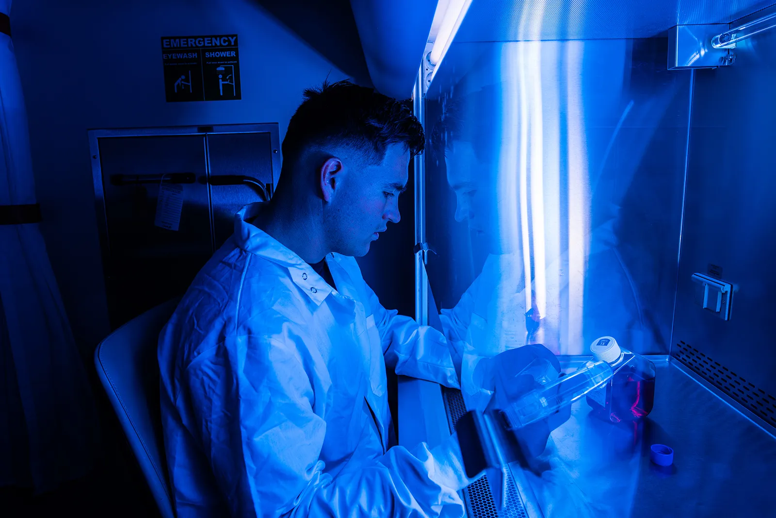 A student works with liquid nitrogen in a science lab on BYU campus.
