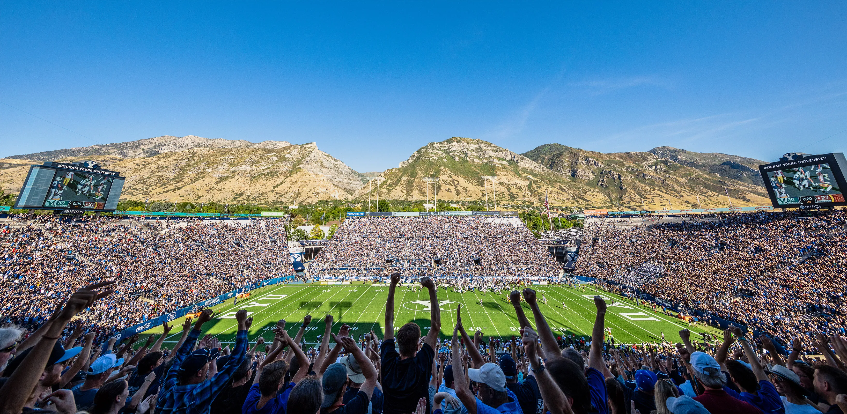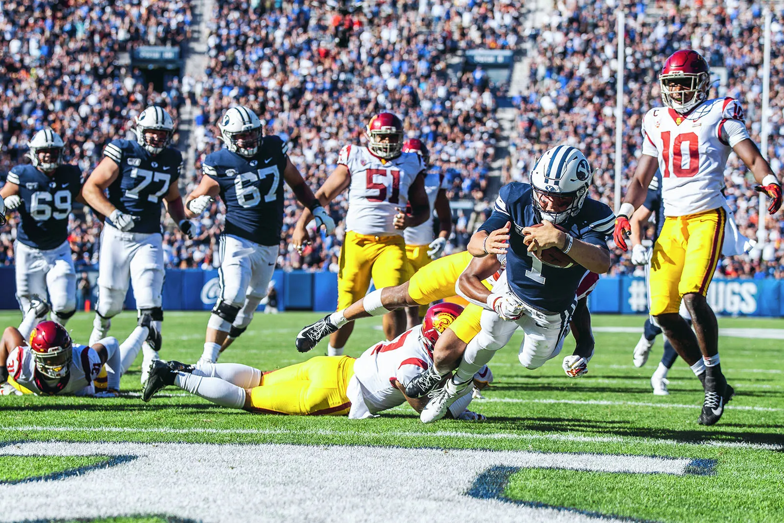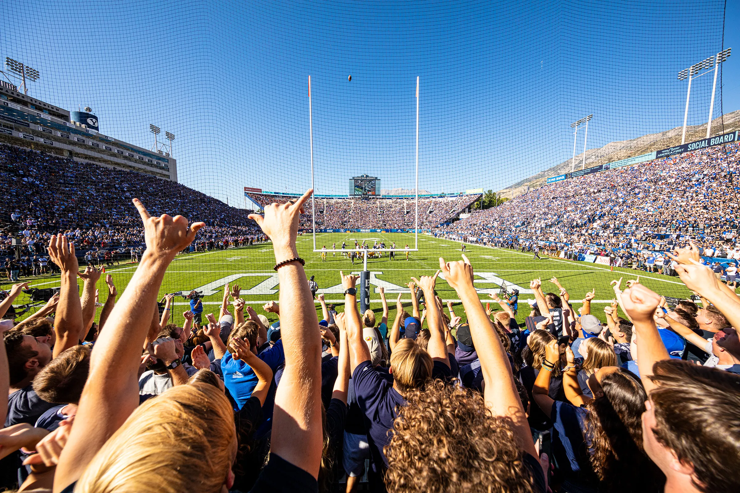 This is the moment when BYU won in an upset versus USC after a goal line stance in overtime. The crowd proceeded to go crazy and rush the field right after.