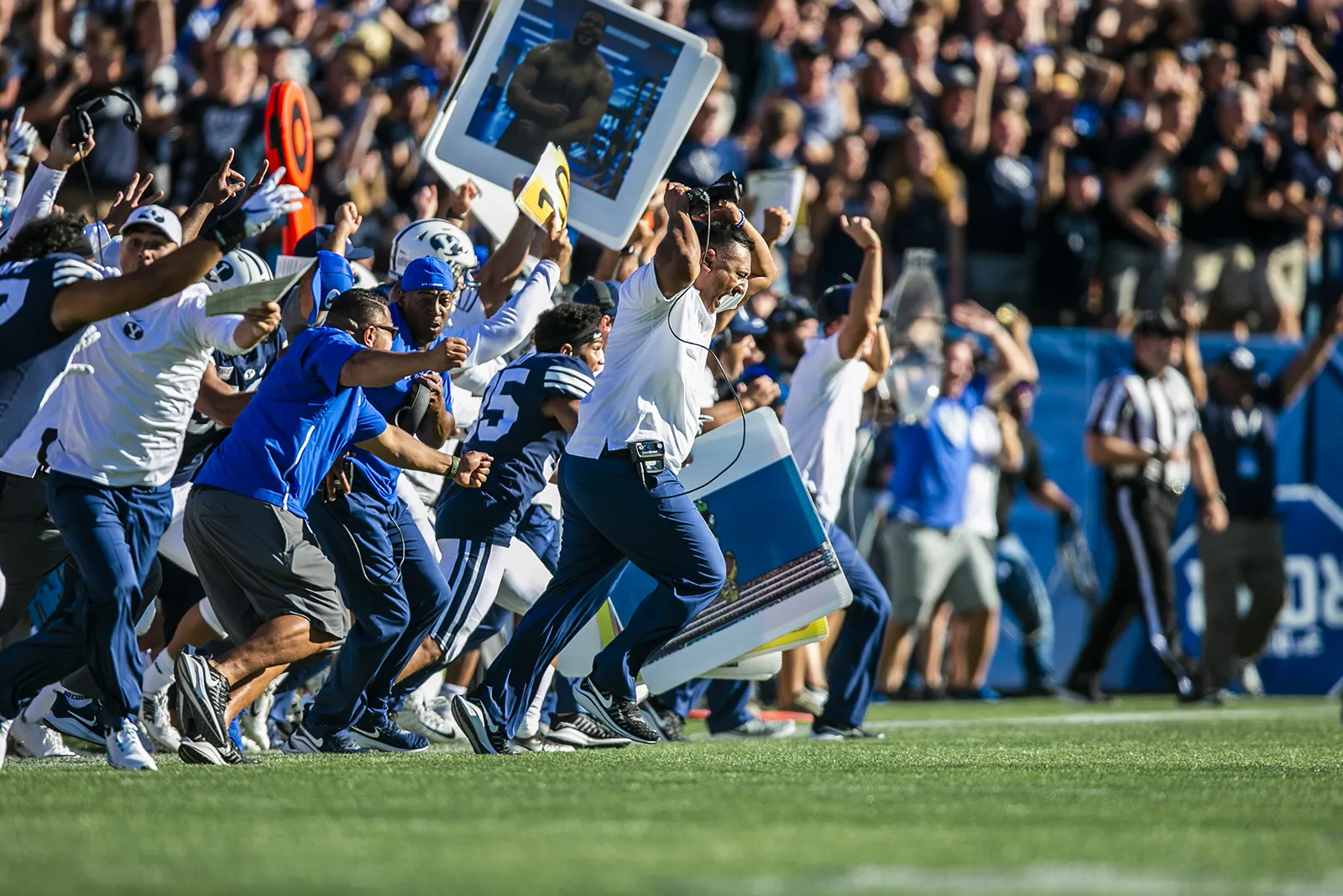 Coaches rush the field after BYU wins against USC in an intense, overtime game.