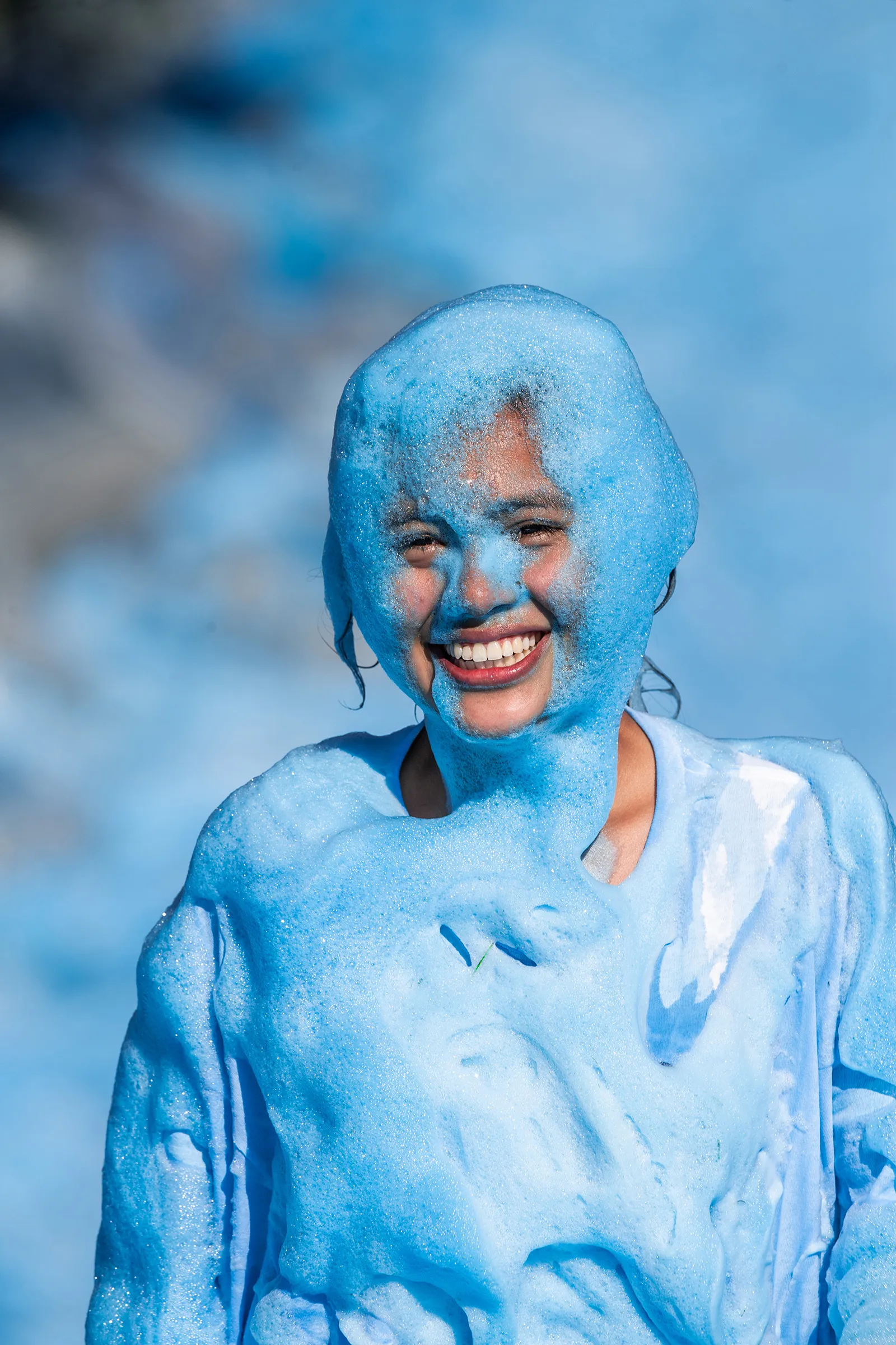 Photo of a student enjoying BYU's True Blue Foam event before homecoming week.