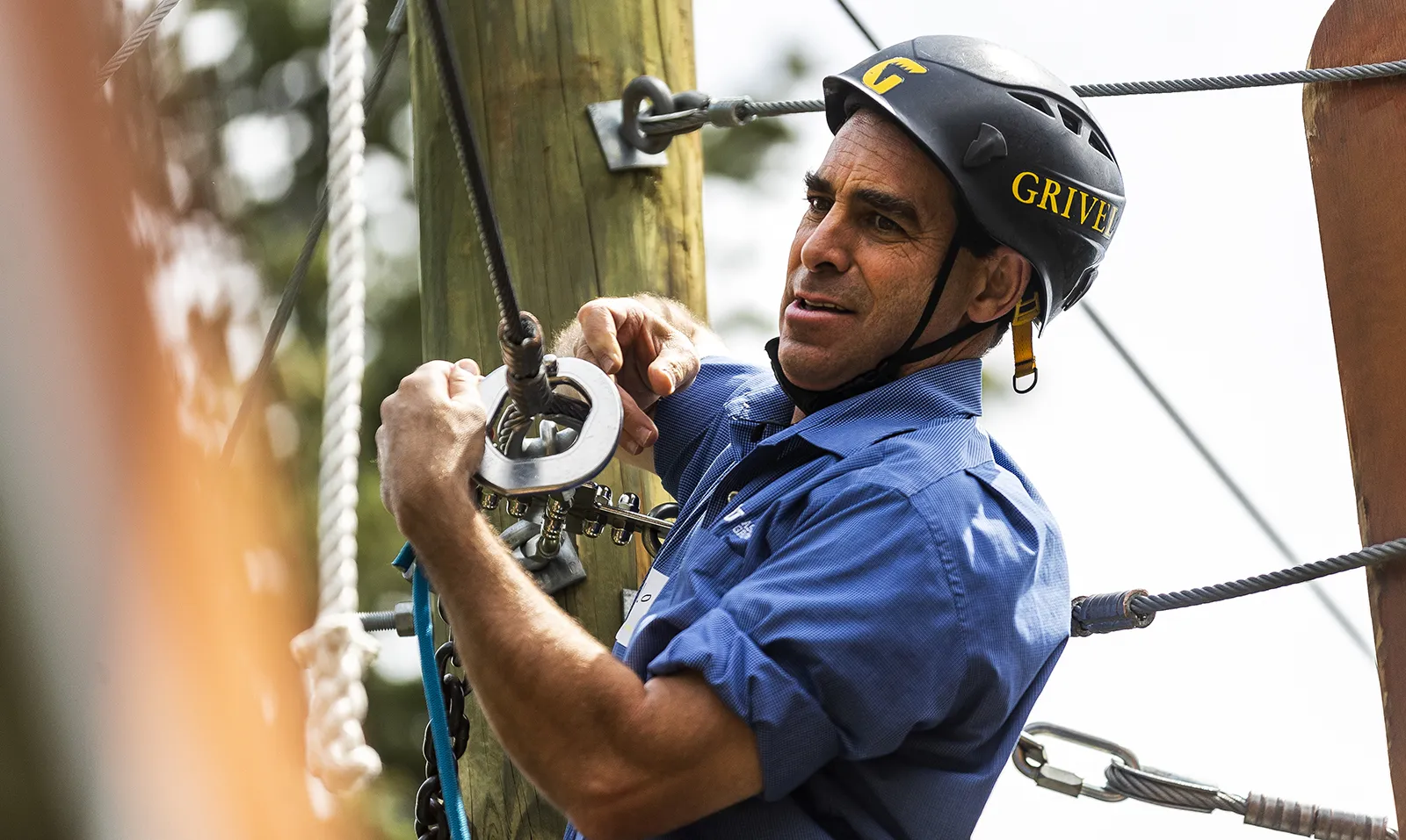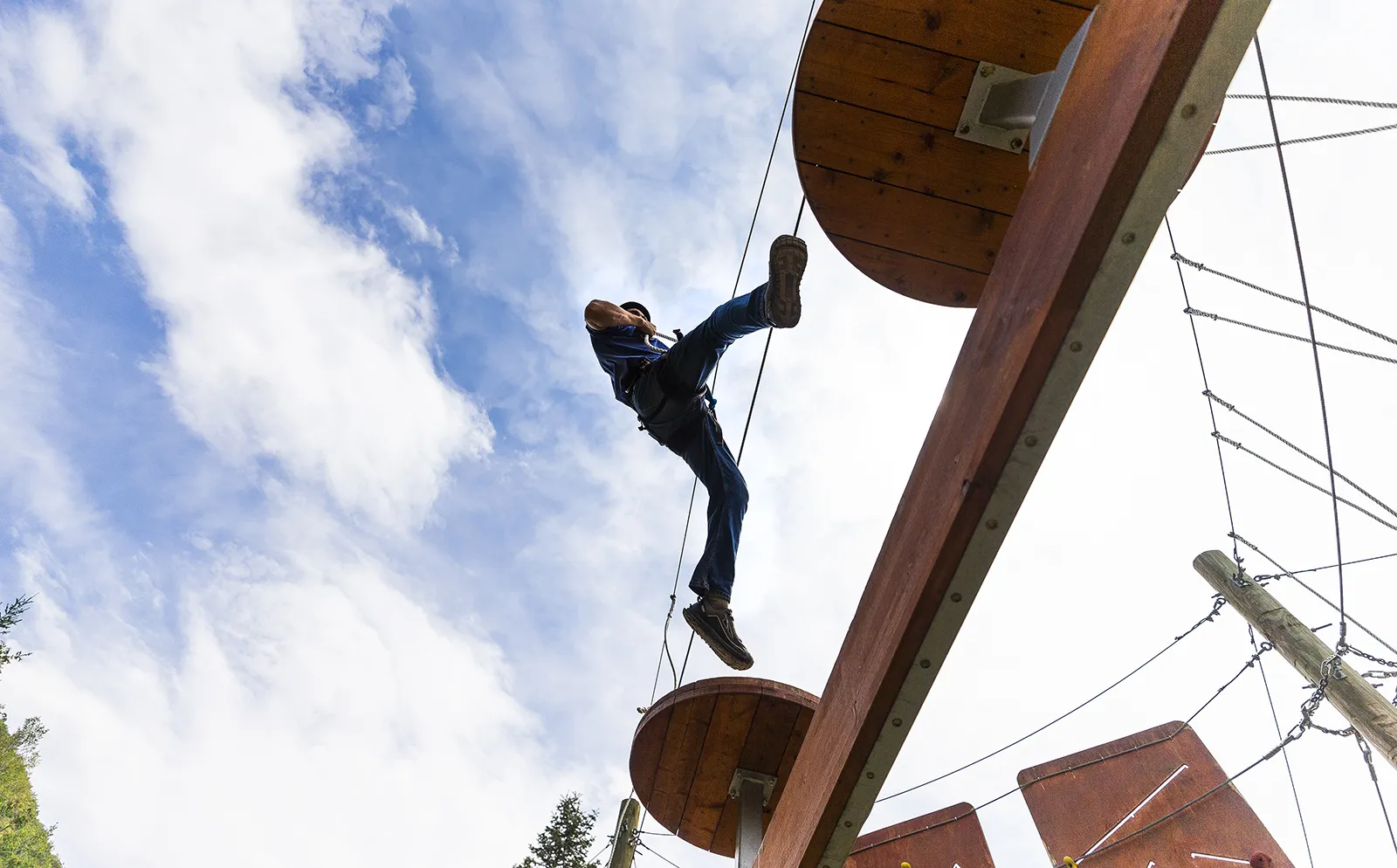 Company employee on the ropes course at a Corporate retreat.