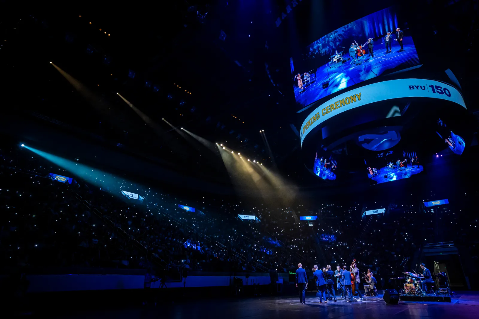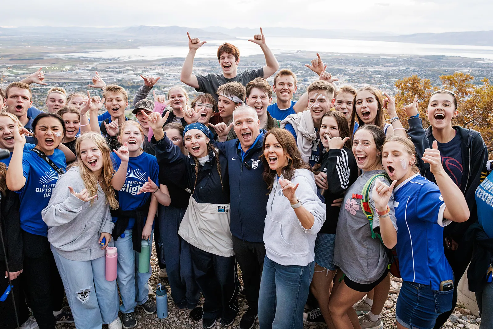 President and Wendy Reese cheer with a group of students after completing the annual homecoming hike before lighitng the Y.