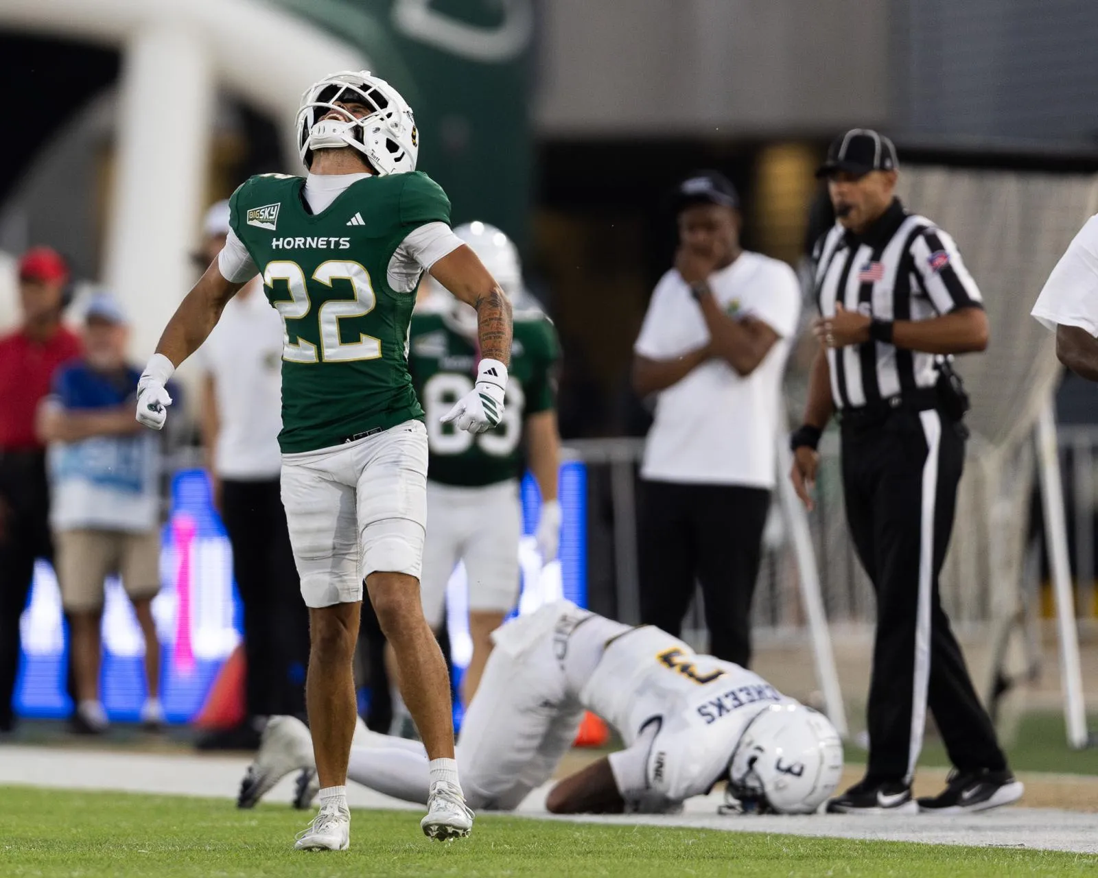 Number 22 of the Sacramento State Hornets celebrates as he deflected a critical 4th down stop.