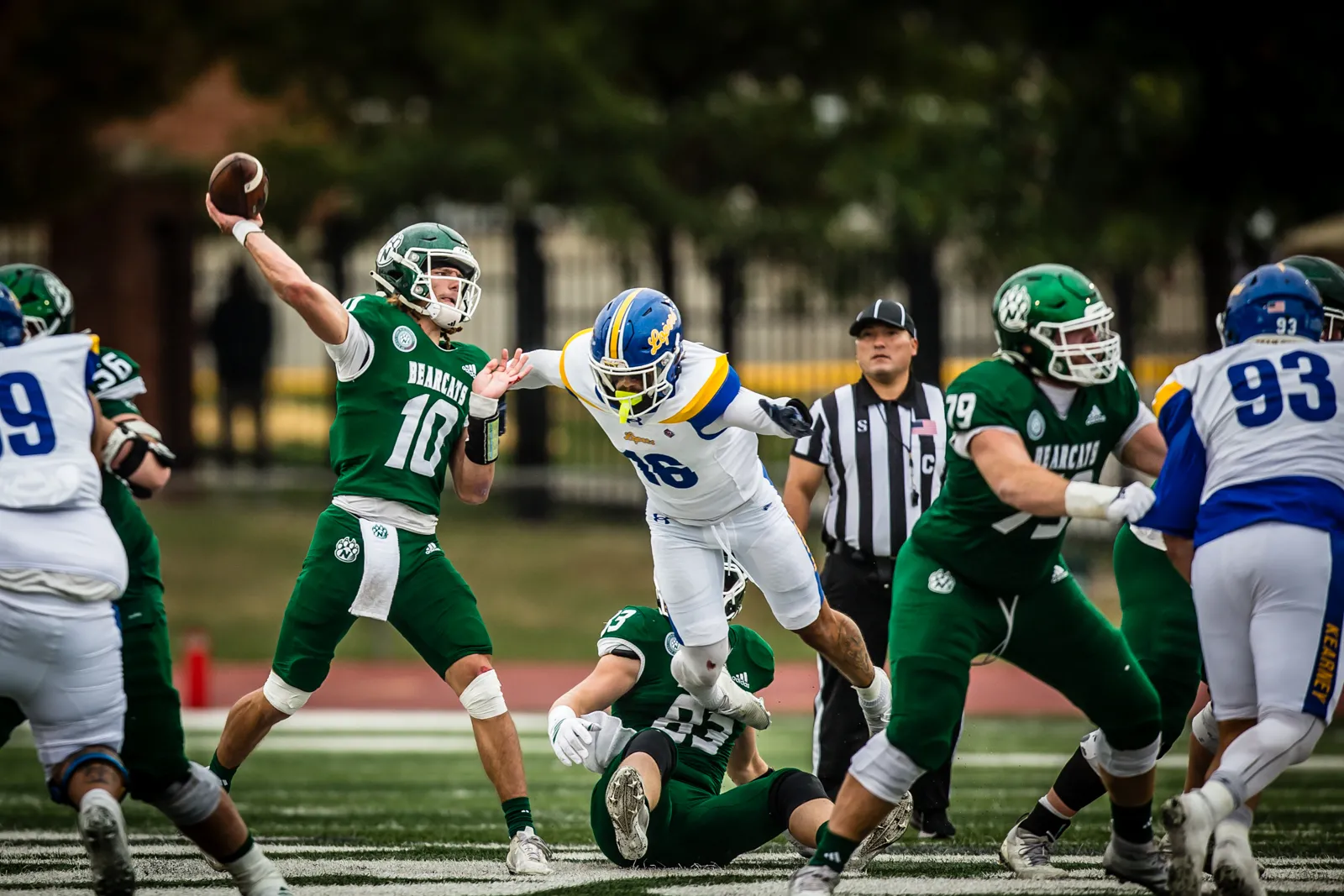 The Lopers defense attempts to sack the Bearcat Quarterback during the Northwest Homecoming Football Game. October 25th, 2025.
