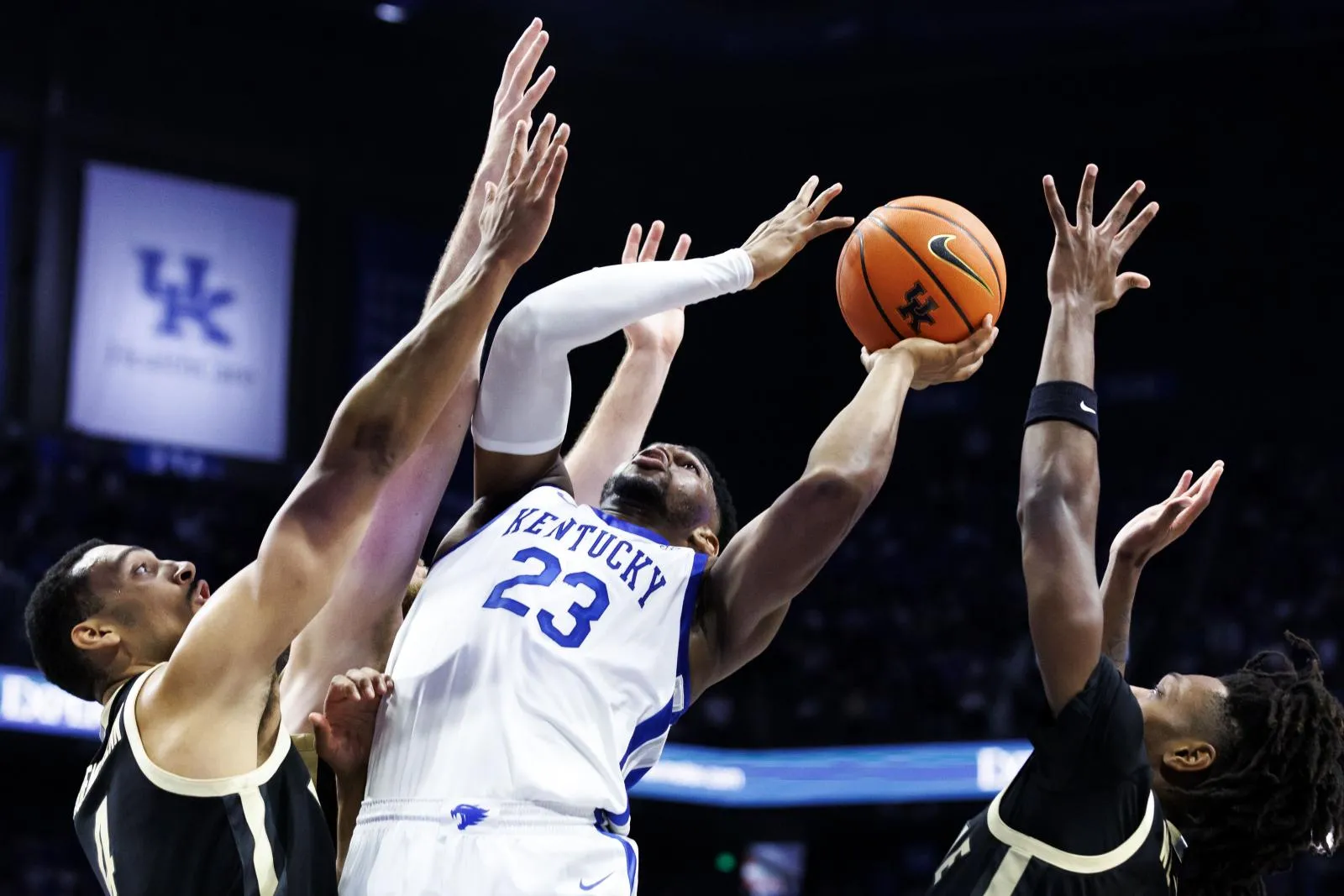 A Mouhamed Dioubate battles for a rebound against several defenders during a high-intensity possession, extending above traffic to secure the ball in the paint.