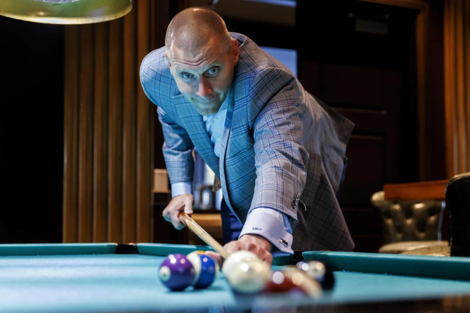 A quiet moment away from the court, where strategy slows into focus. Even here, the competitive edge shows — steady aim, calm presence, and a mind always working the angles.