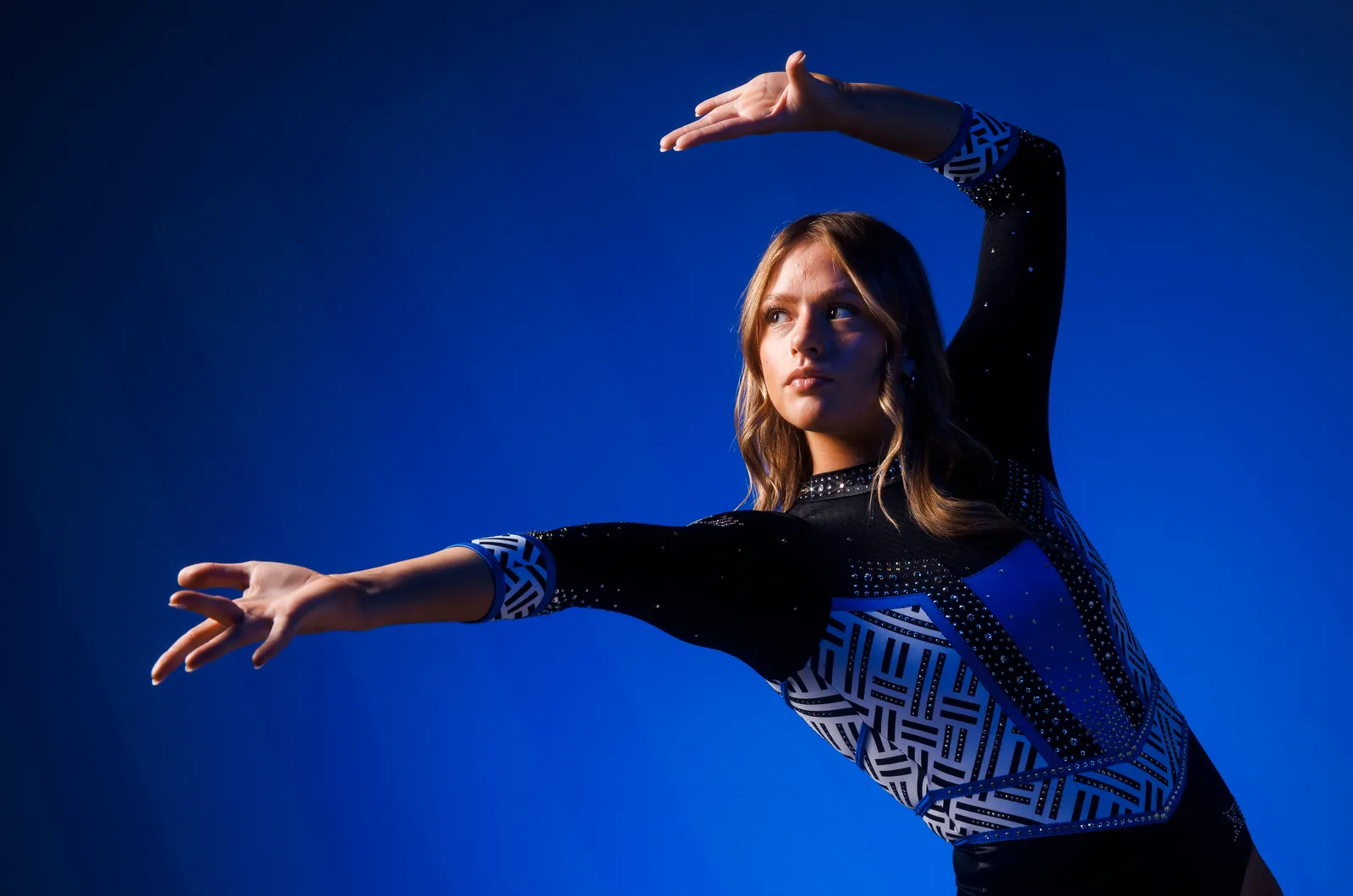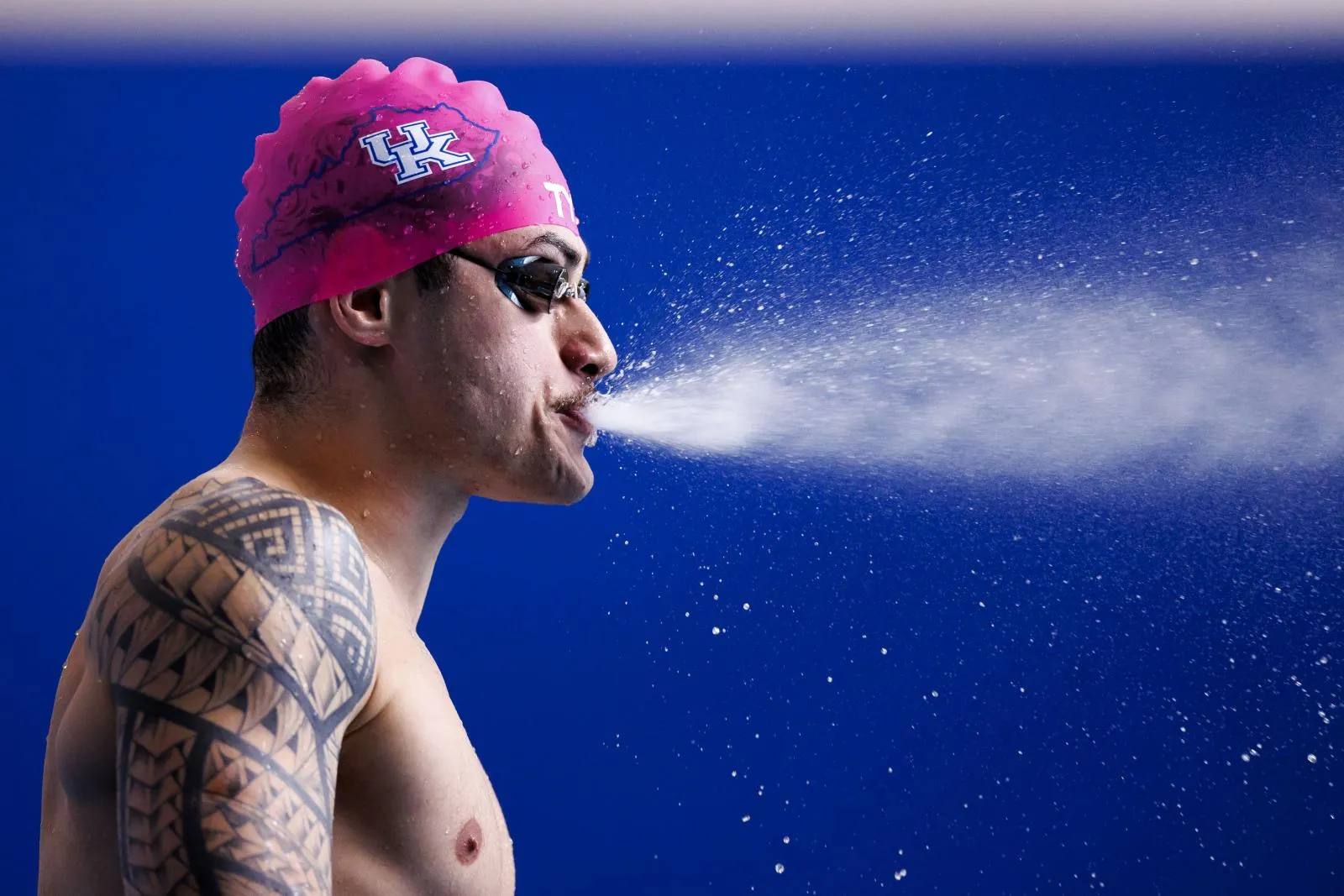 A Kentucky swimmer prepares on the pool deck, releasing a controlled breath in a moment of calm before competition. Water droplets linger on his skin, capturing the focus and controlled intensity of race day.