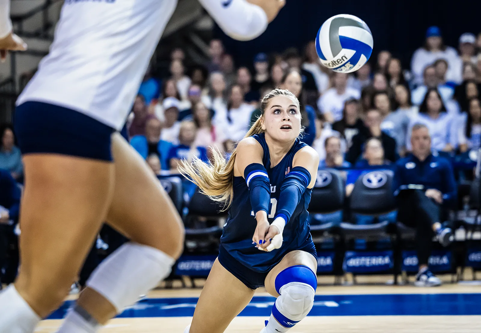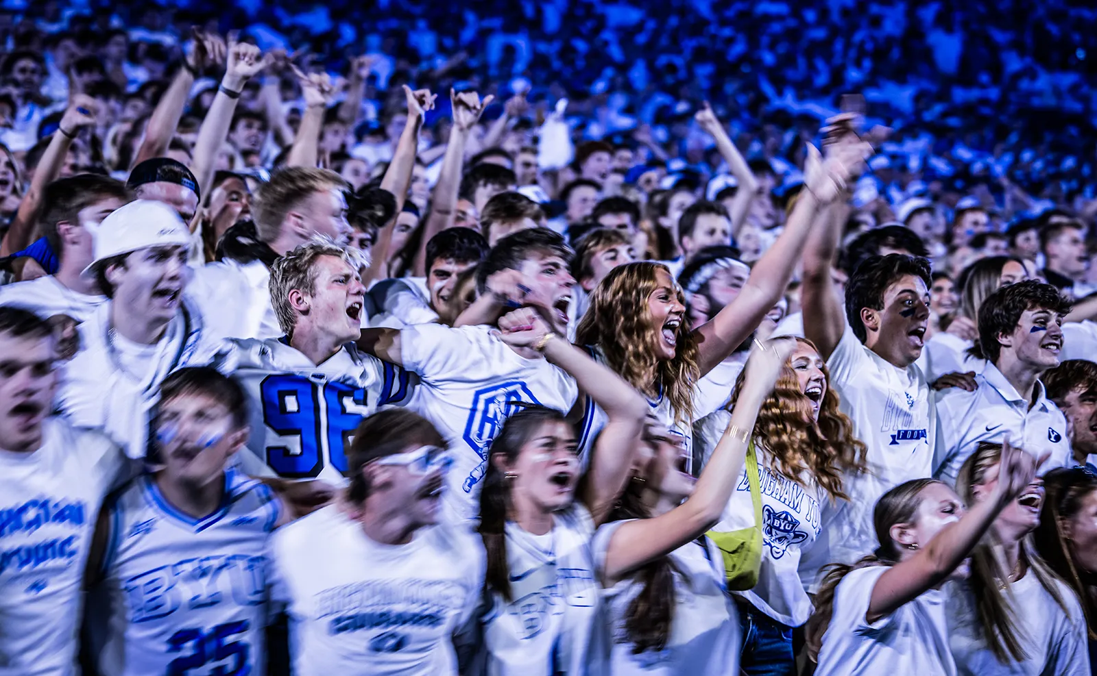 Slow-shutter photo capturing the movement of rowdy student section at football game.