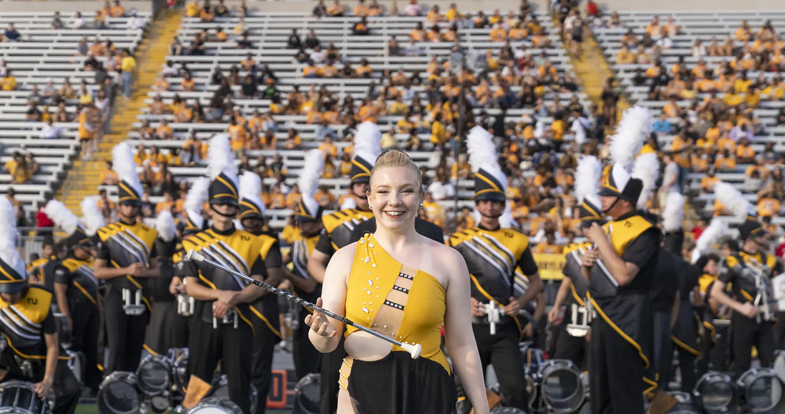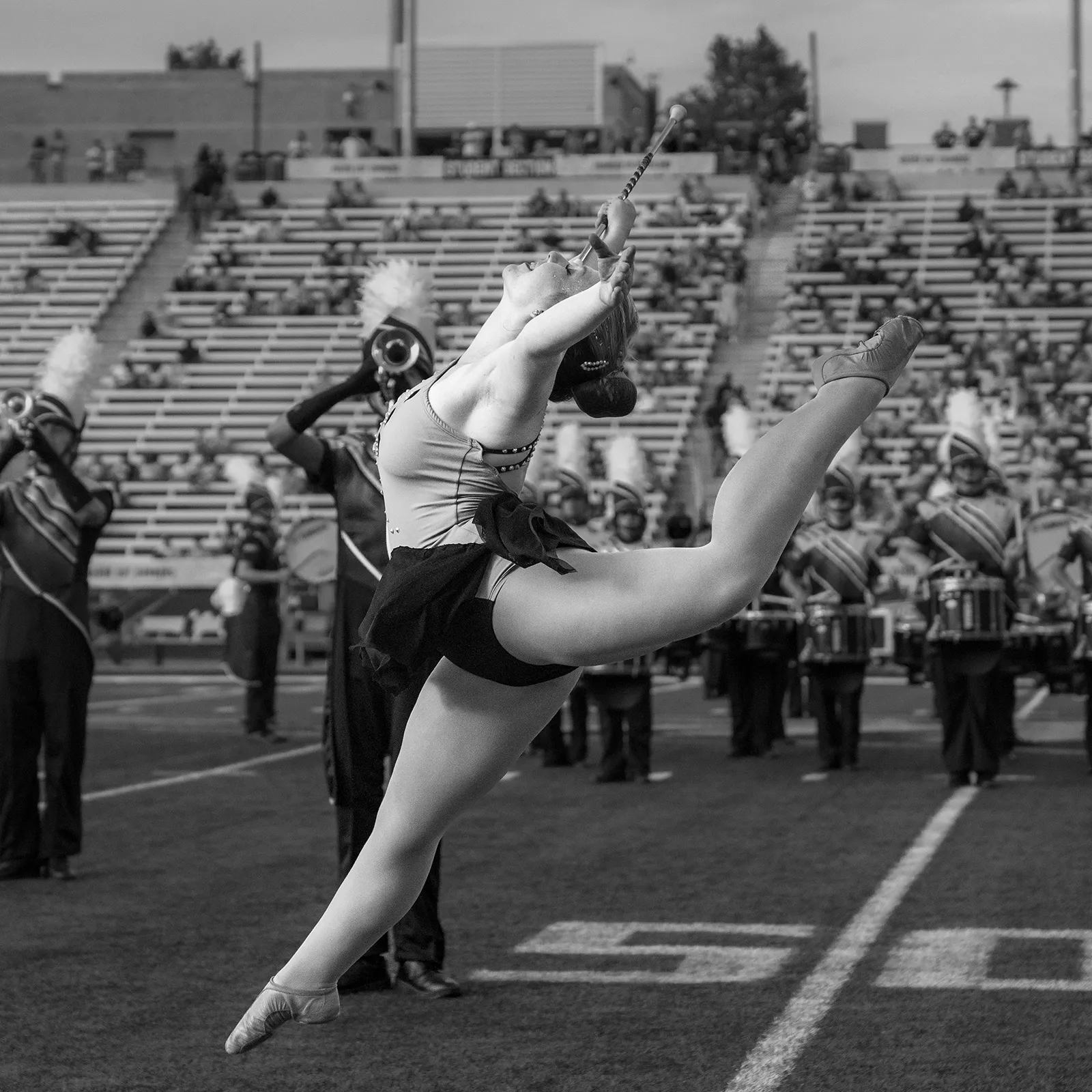 The baton twirler impresses the crowd with her impressive spilt leap.