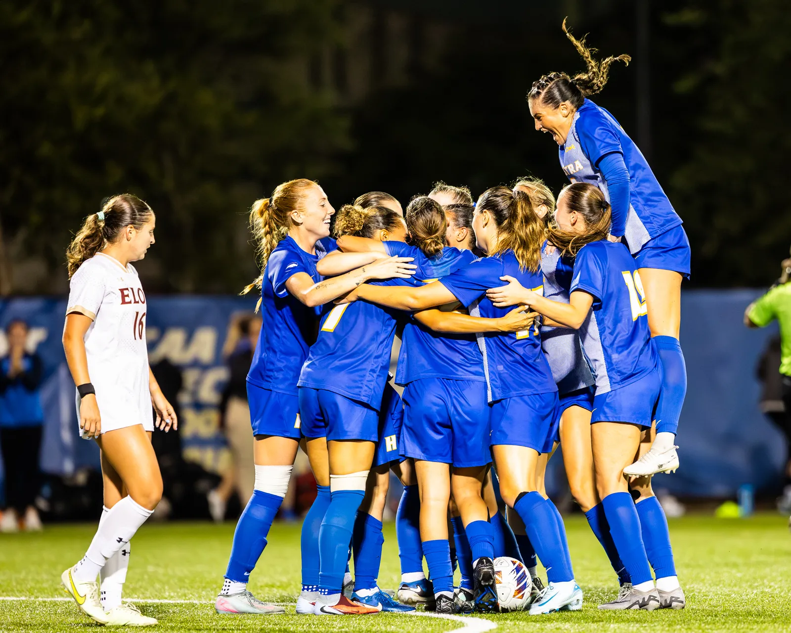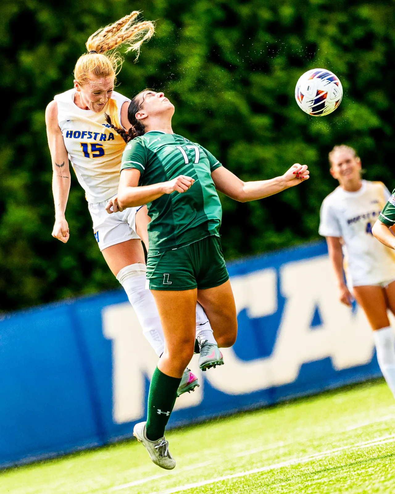 Soccer player Olivia Pearse completes a header and beads of sweat orbit the ball
