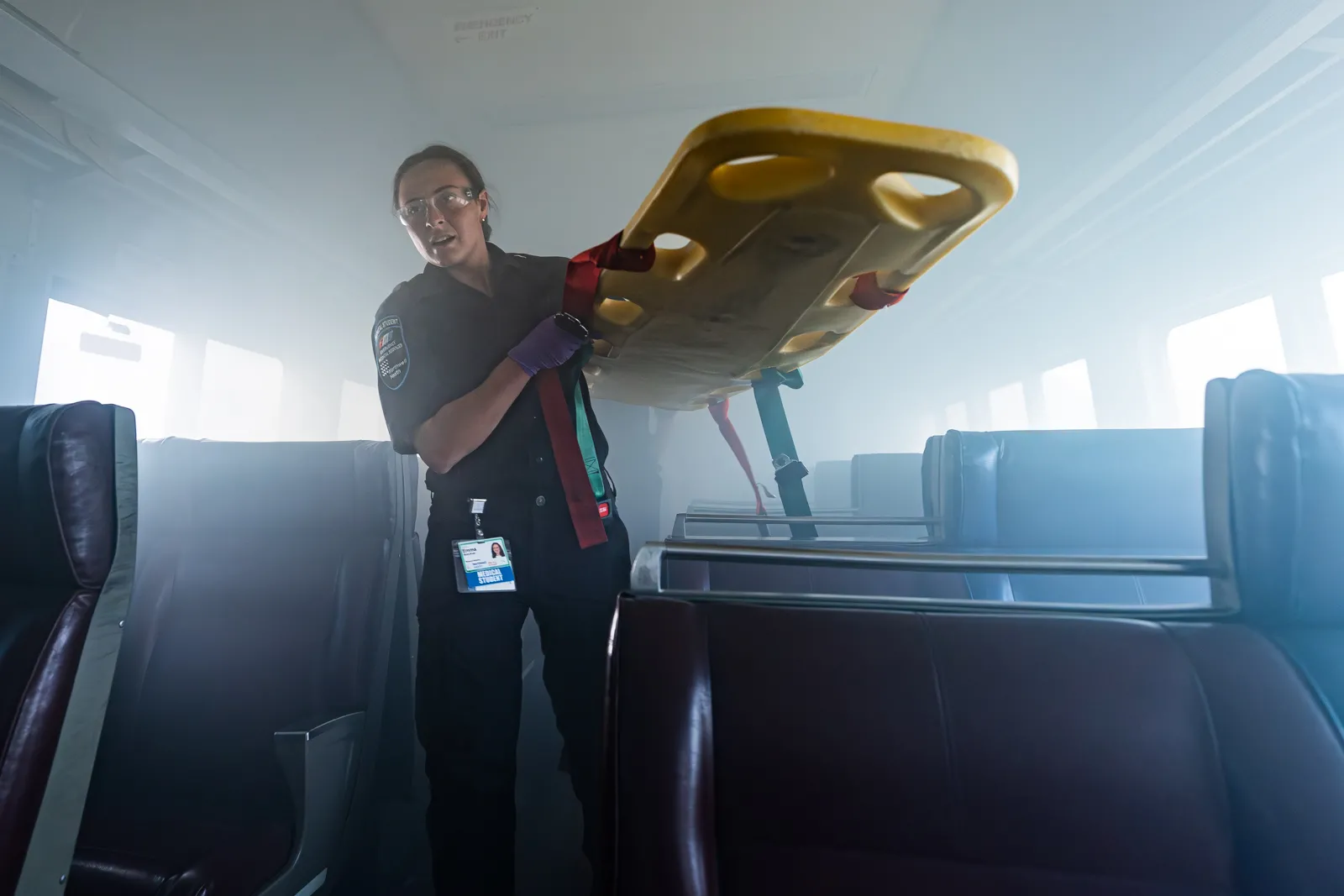 Medical student rushes into a simulated train derailment with equipment ready to transport the injured
