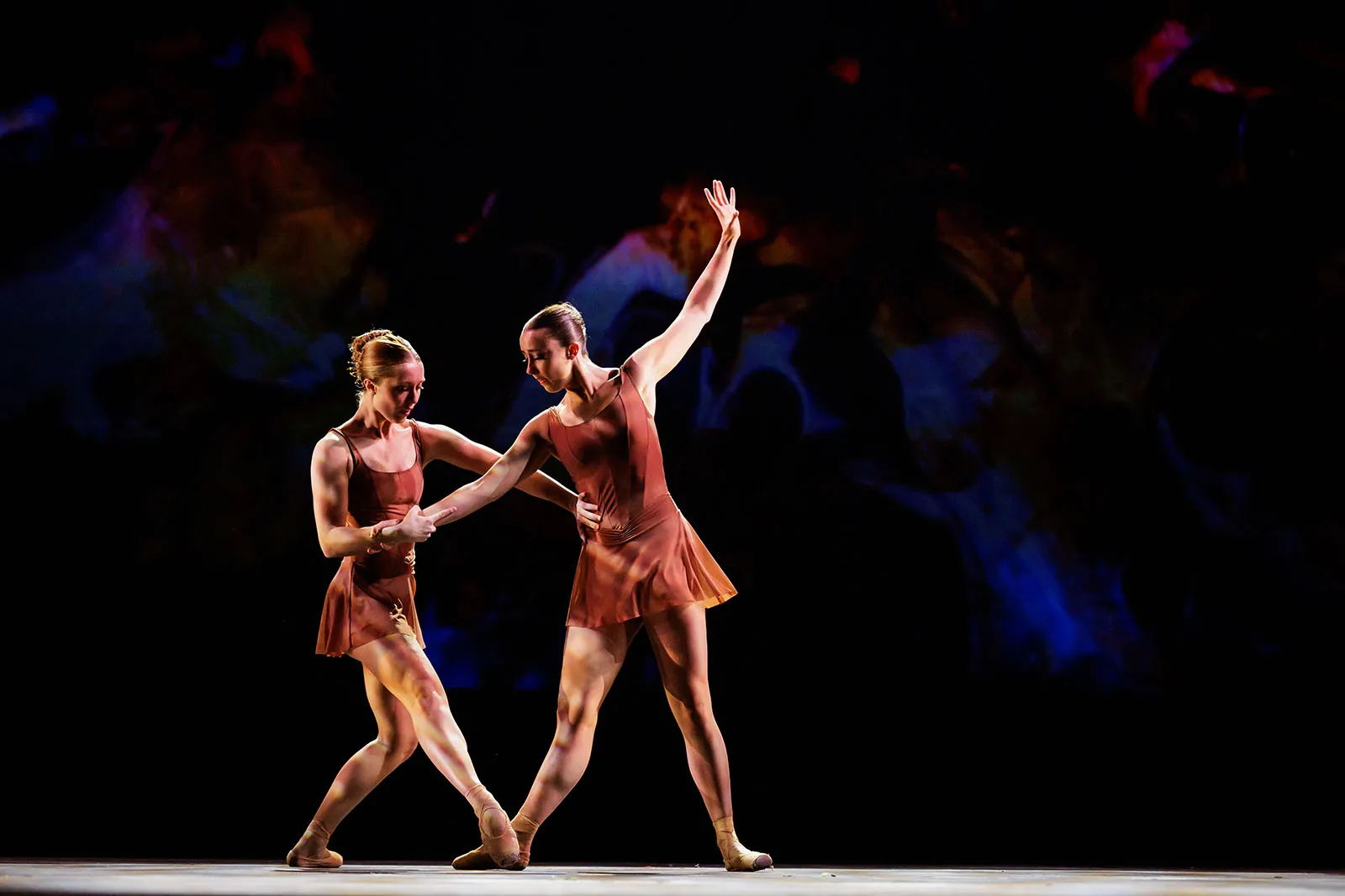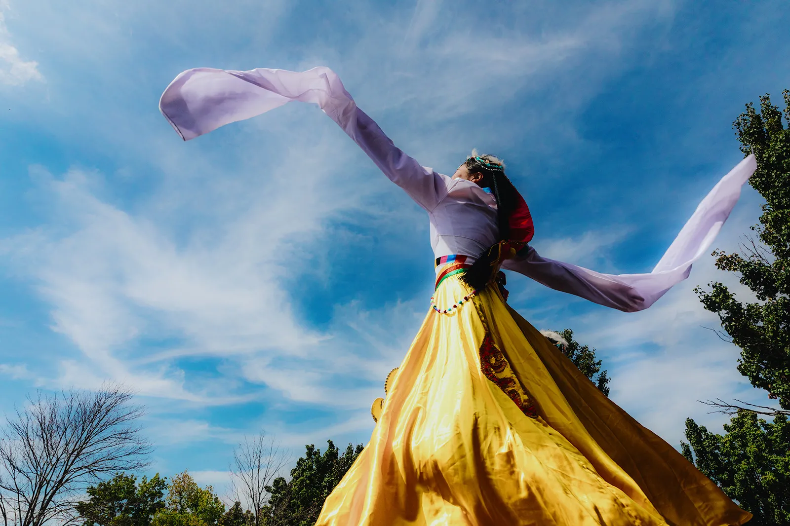 With hands raised high, the dancer moves in harmony with the rhythms of a traditional dance.