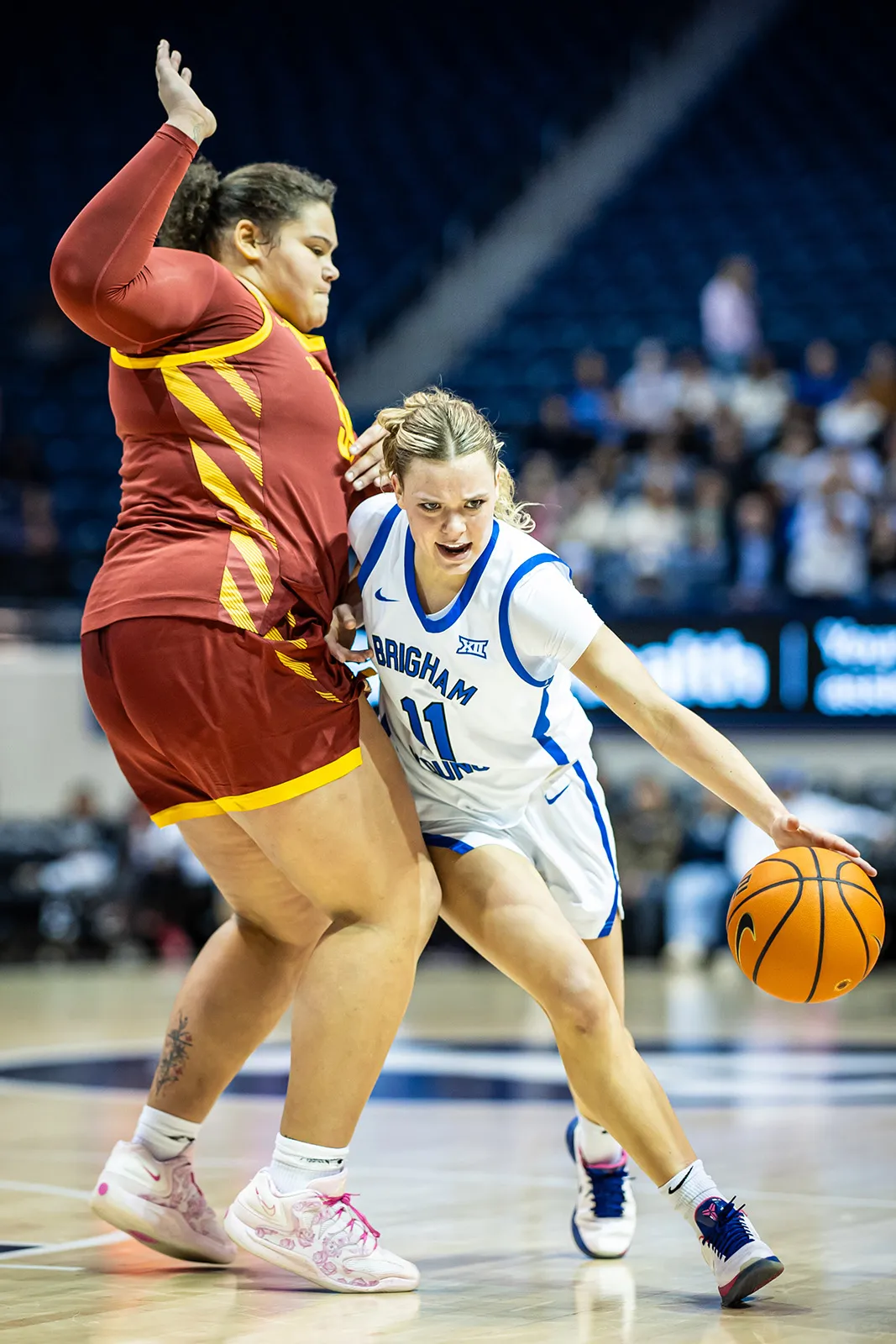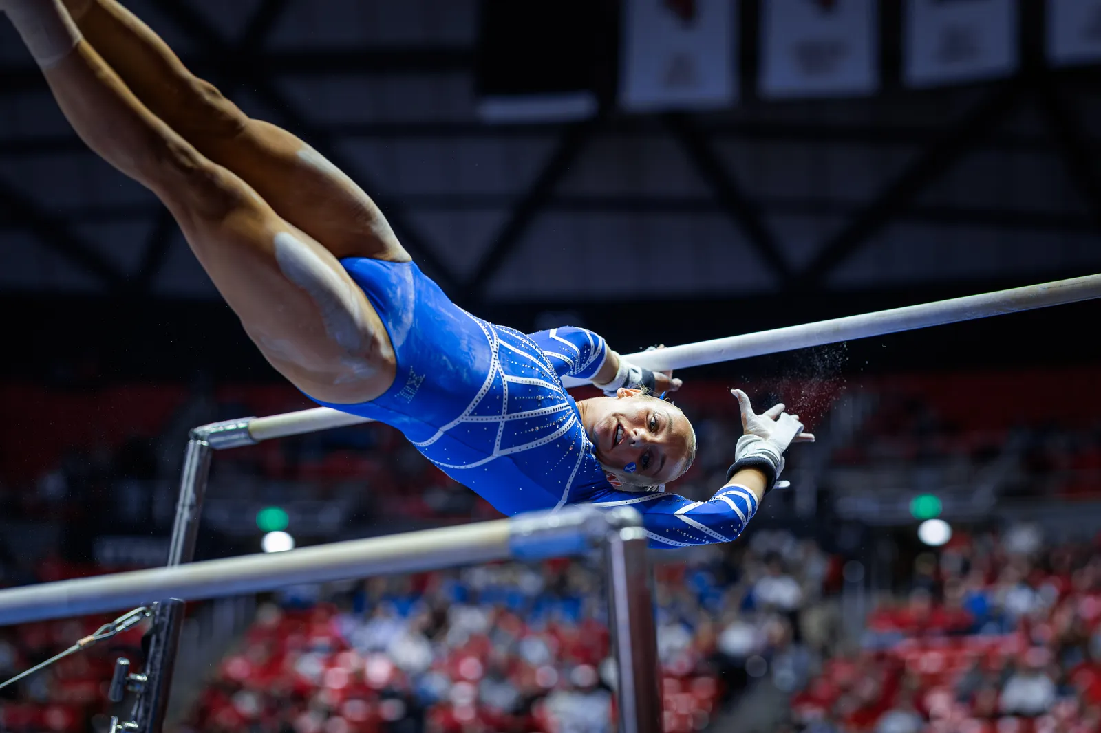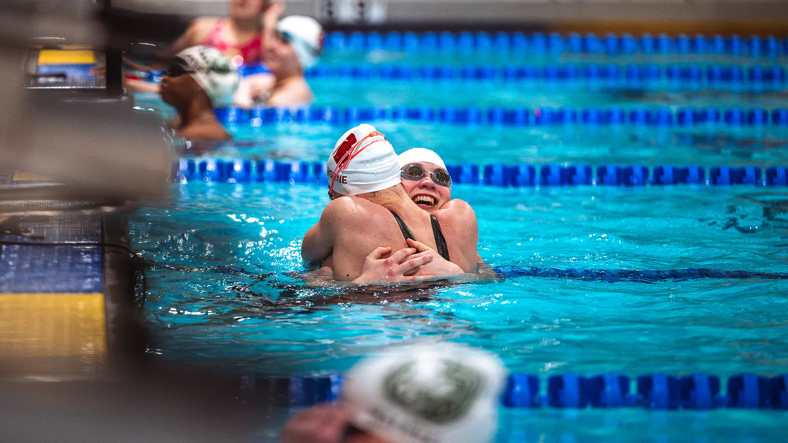 Jamie Horne (left) and Sophia Wells (right) embrace after taking 1st and 2nd place together in the 50 freestyle.