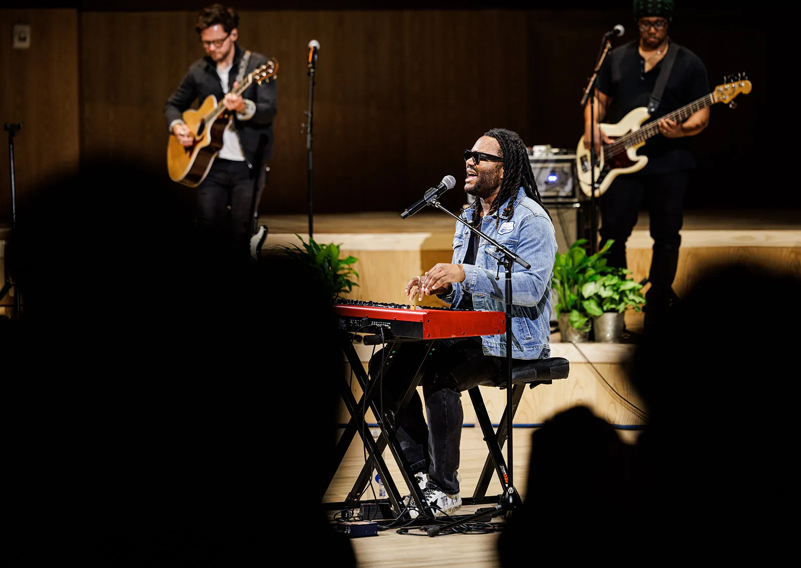 A photo of GRAMMY-winning music artist Blessing Offor performing at a on campus concert.