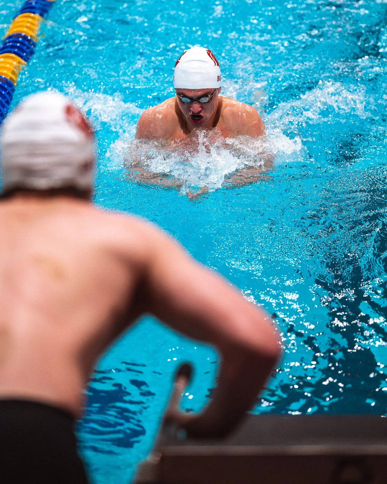 Sam Dearing (left) cheers on his teammate Holton Bundy (right) on the first 50 of his breaststroke during the 400 medley relay.