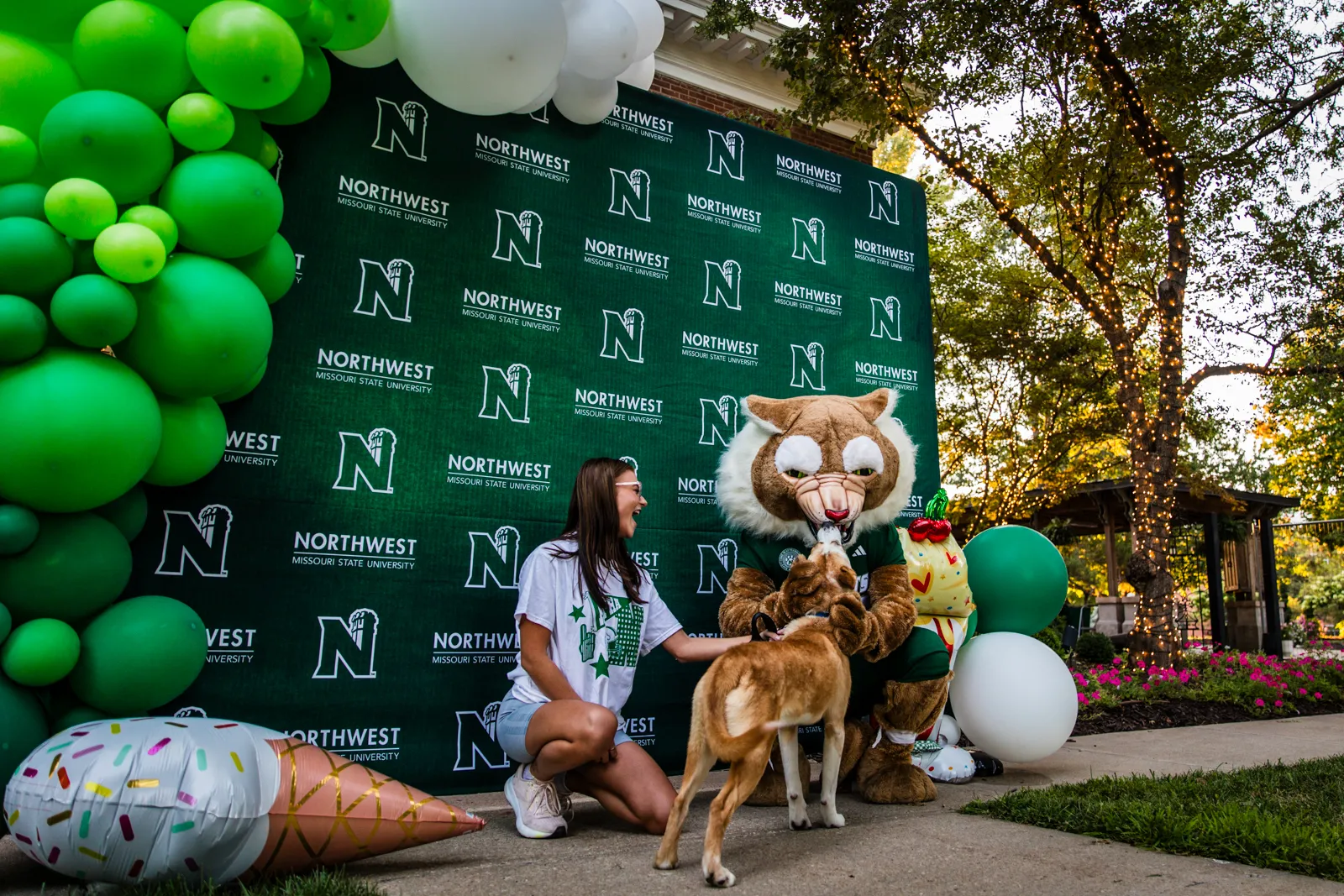 Bobby the Bearcat hanging out with a student and her dog at the evening ice cream social, hosted by President, Lance Tatum, and First Lady, Jill Tatum!