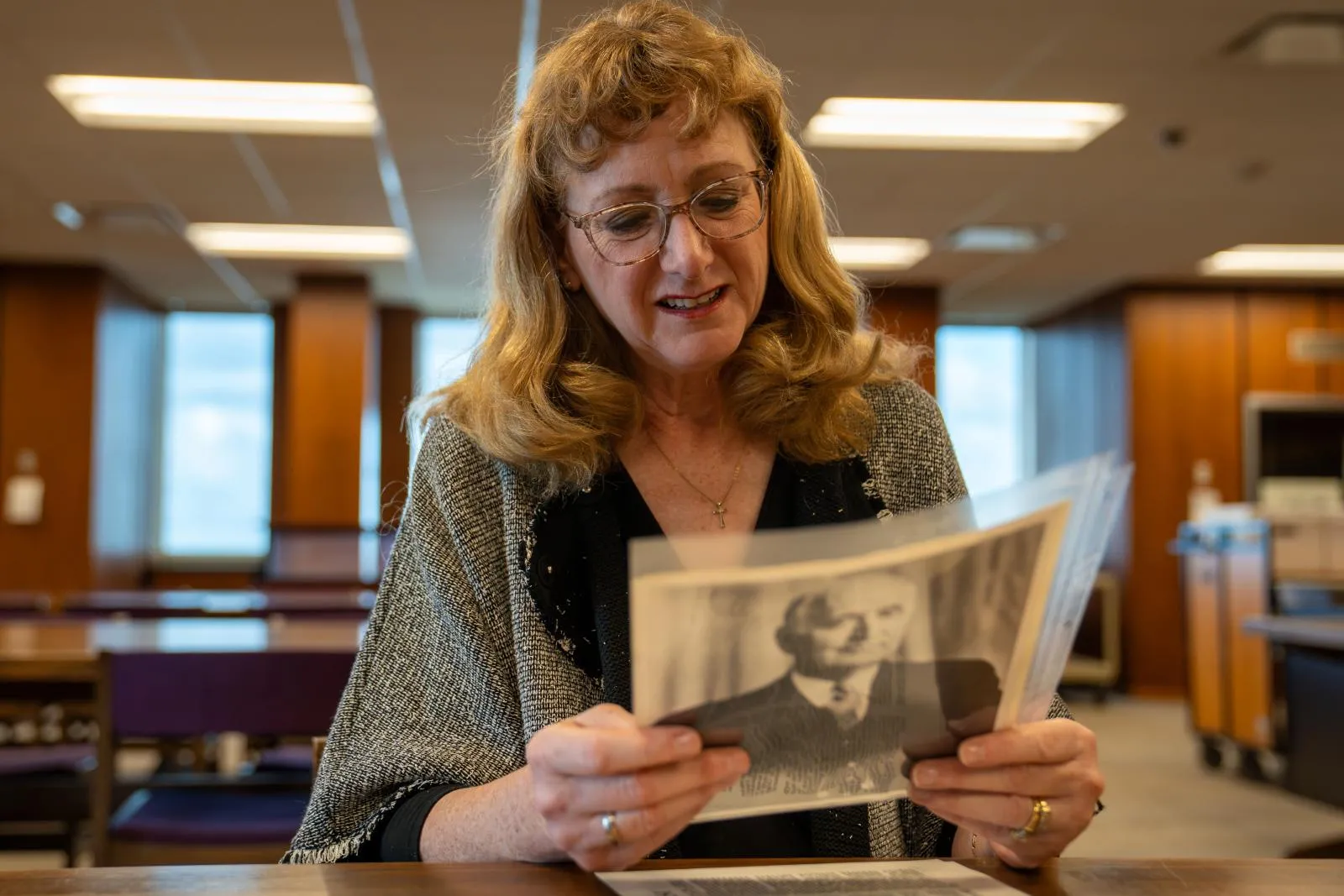 Ellen Englemann the great granddaughter of Kent State's 3rd president James Englemann stares at a photo of him and looks through archived documents from his life