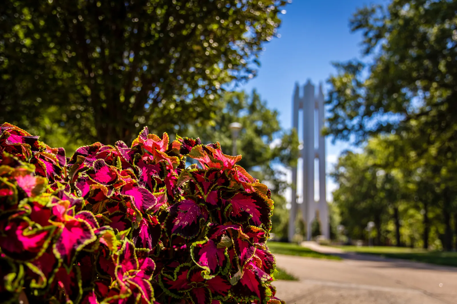 Summer florals were in full bloom, on the Northwest Missouri State University central campus near the bell tower.