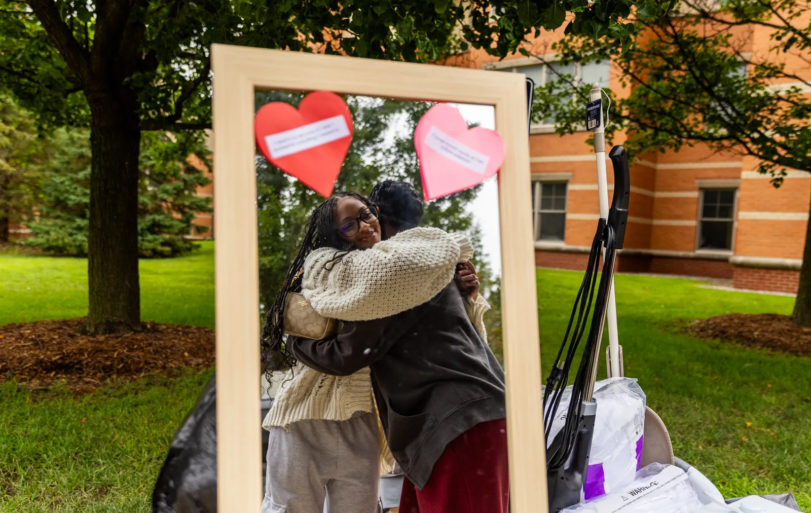 Senior Jasmine Jones, a marketing major at Grand Valley State University, embraces her mother, Tacarra Jones, as they meet each other’s gaze through a mirror during move-in day on Tuesday, Aug. 20, 2025.
