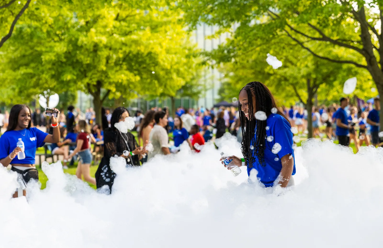 A student roams through the foam during Laker Kickoff on Friday, Aug. 22, 2025, on the Kirkhof Lawn.