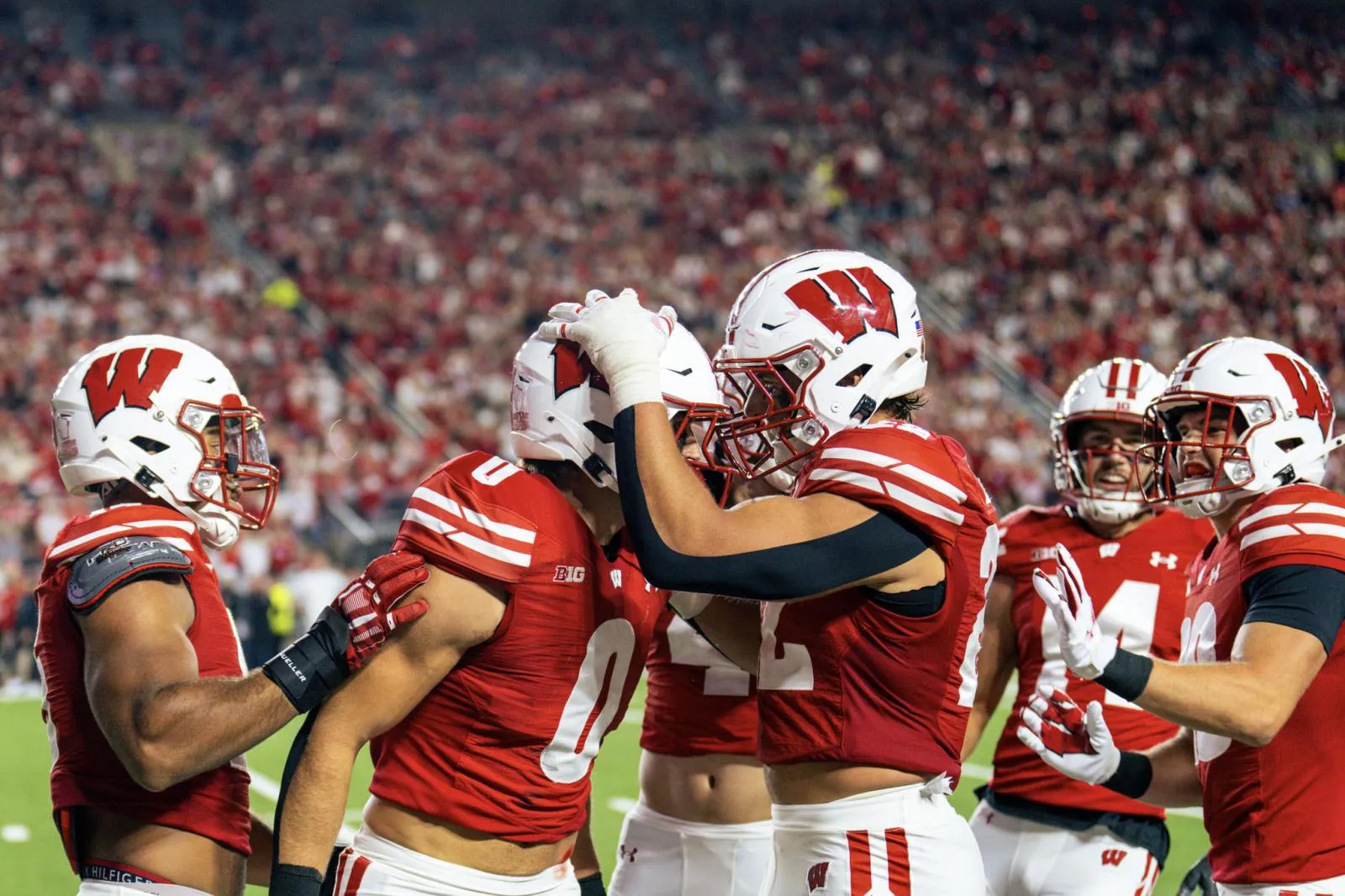 UW-Madison's Badger football players celebrate after a sack against Miami, Ohio's football team.