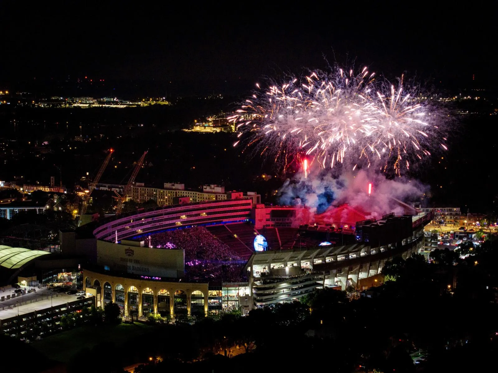 An aerial drone view of UW-Madison's Camp Randall, the school's football stadium -- which was used for concerts for the first time this summer since 1997. This particular moment is during Coldplay's finale, which included a light show and fireworks. I am an FAA certified commercial drone pilot and this flight was done legally and in coordination with university and city police.