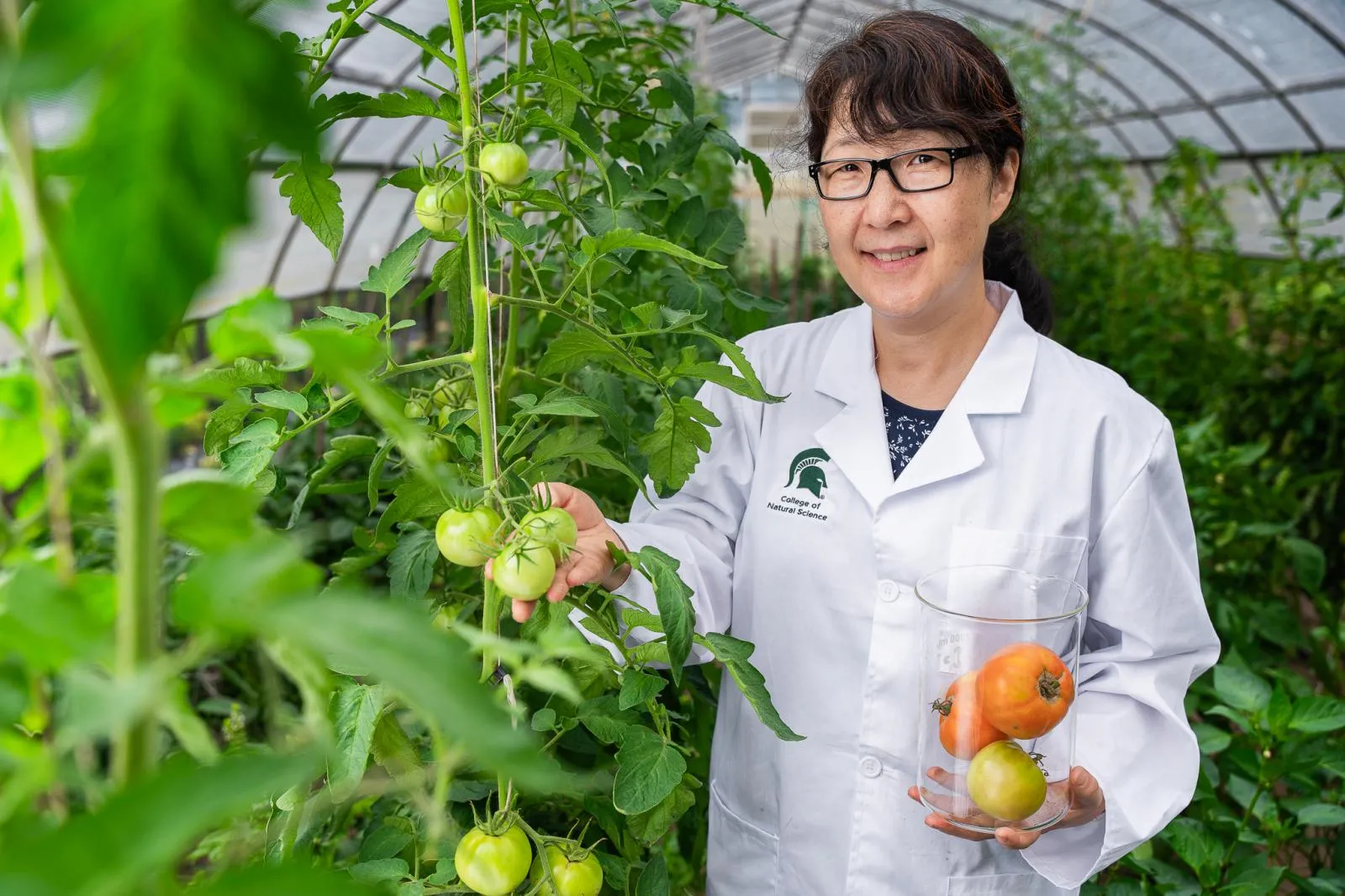 Sue Rhee stands for a photo in the Michigan State Student Organic Farms.