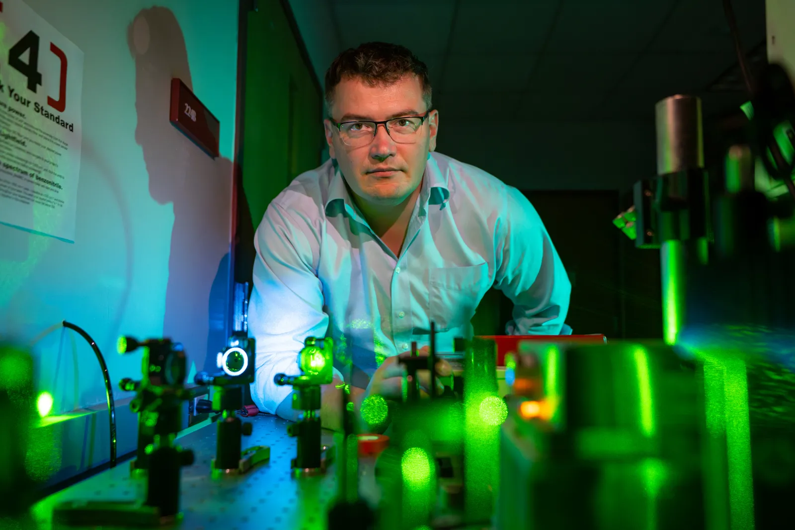 Dmitry Kurouski Ph.D, stands in front of the nano-infrared spectroscopy (afm-ir) for structural characterization of amyloids and plant waxes on Tuesday, Jul 29, 2025 in College Station, Texas. (Hannah Harrison/Texas A&M AgriLife)