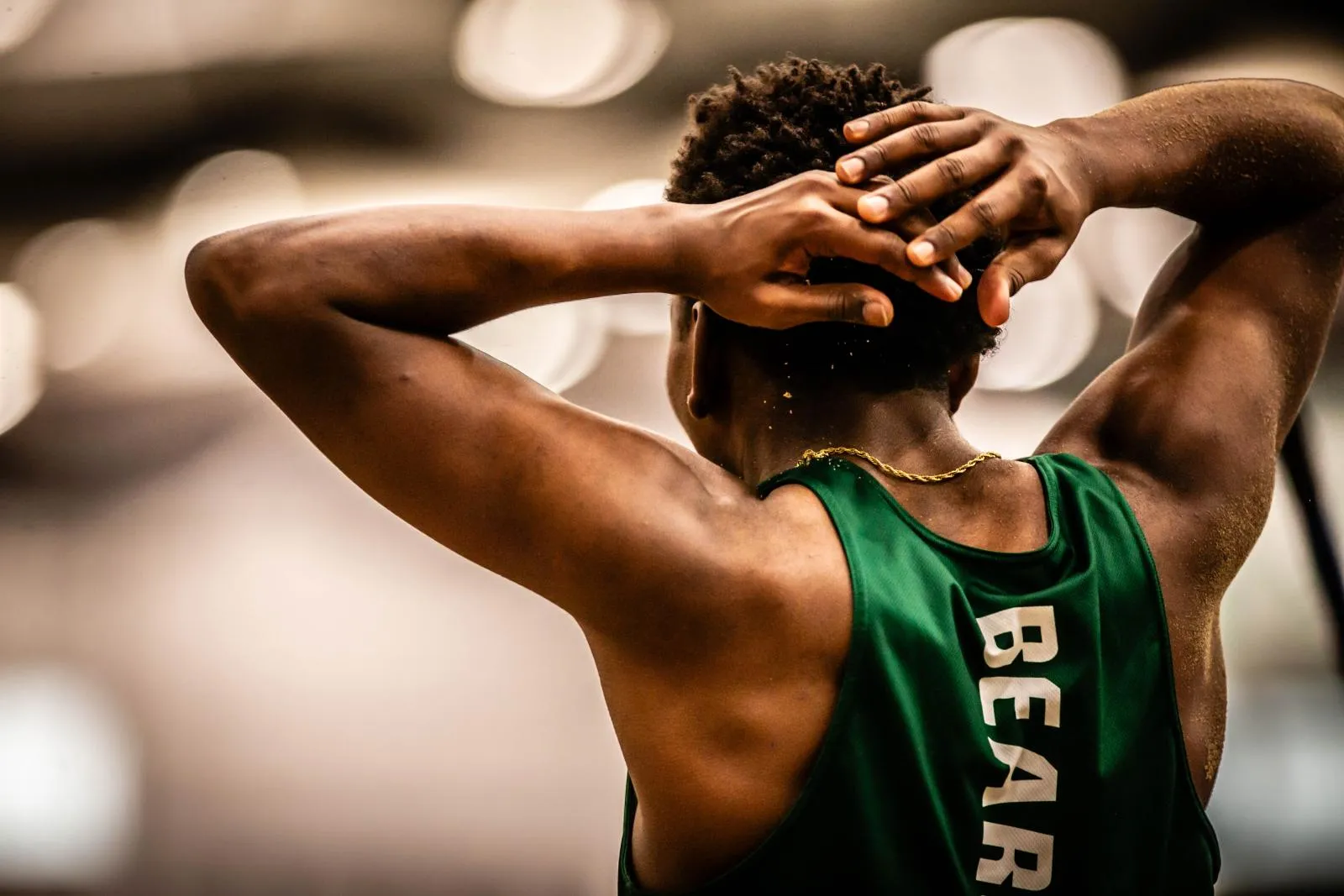 After making his mark, a long jumper waits for his measurement as sand falls from his hands. Northwest Missouri State University | February 19, 2026.