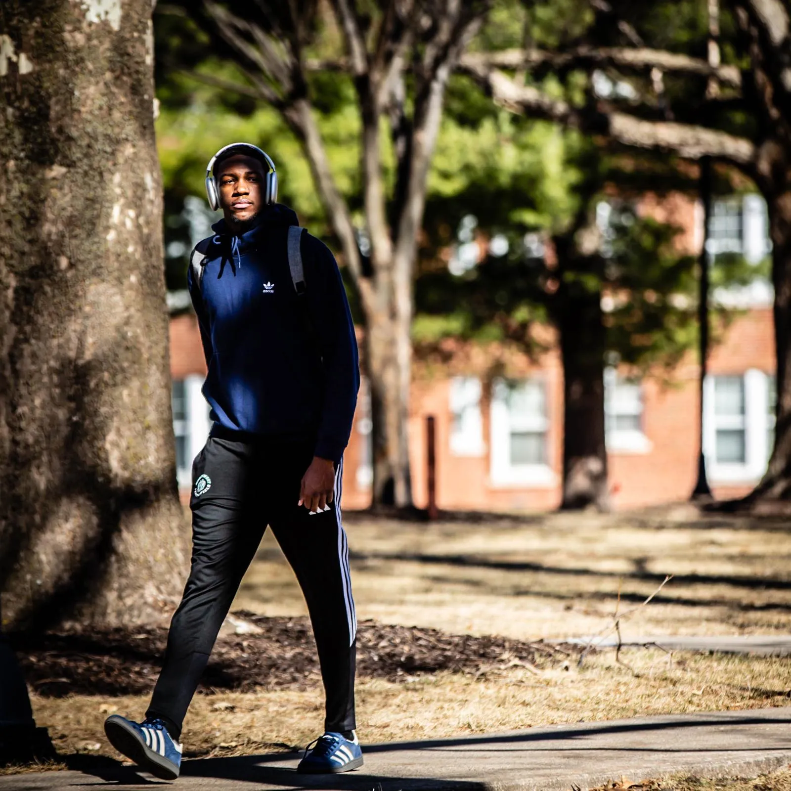 A Northwest student walks to class as the warm sun highlights his face. Northwest Missouri State University | February 26, 2026.
