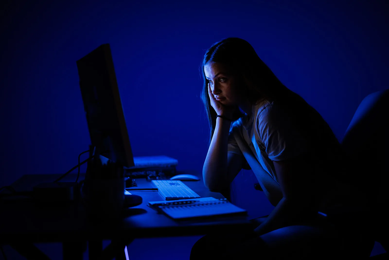 A student models for a feature photo for an article about the impacts of zoom on work culture.