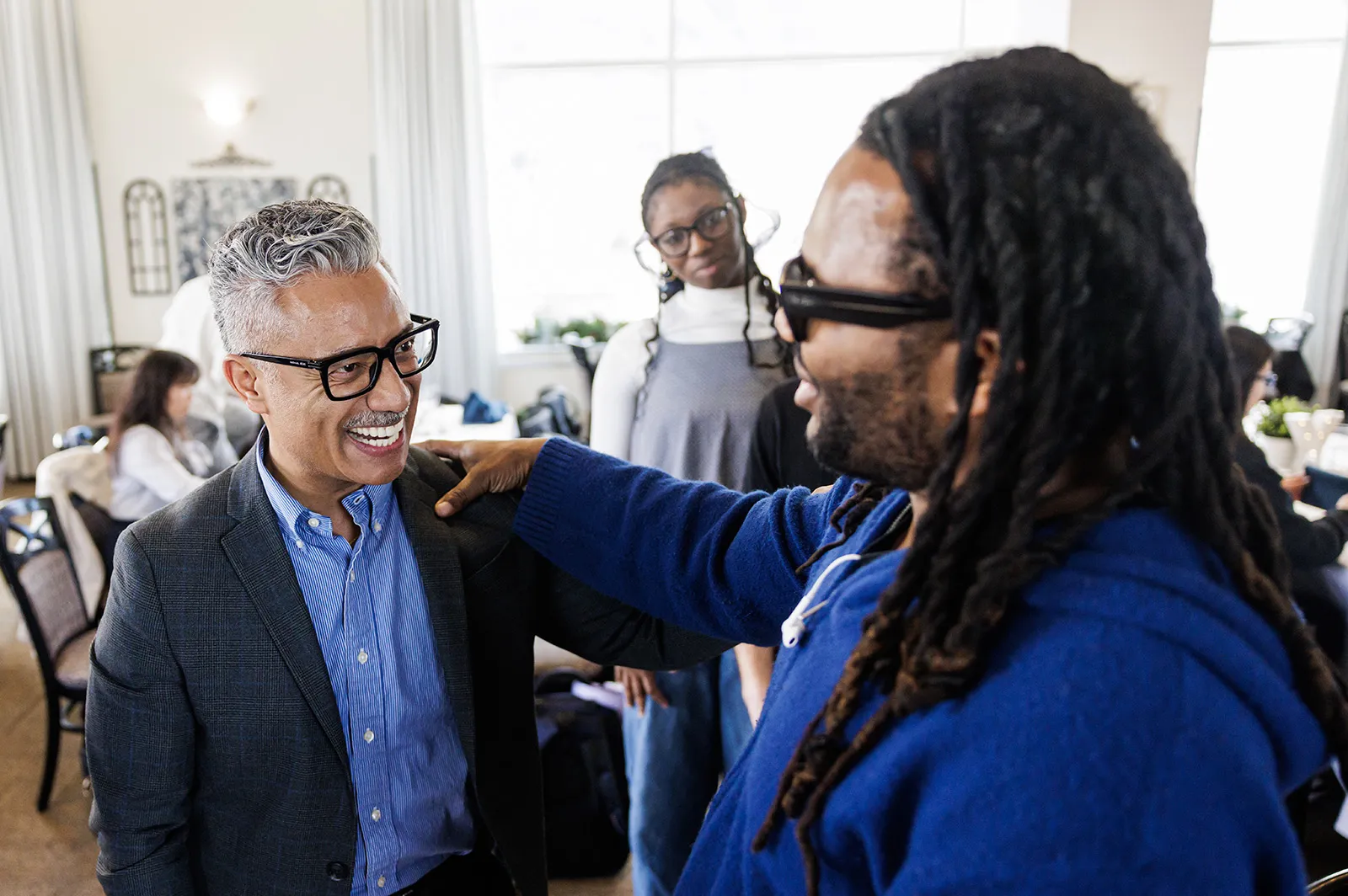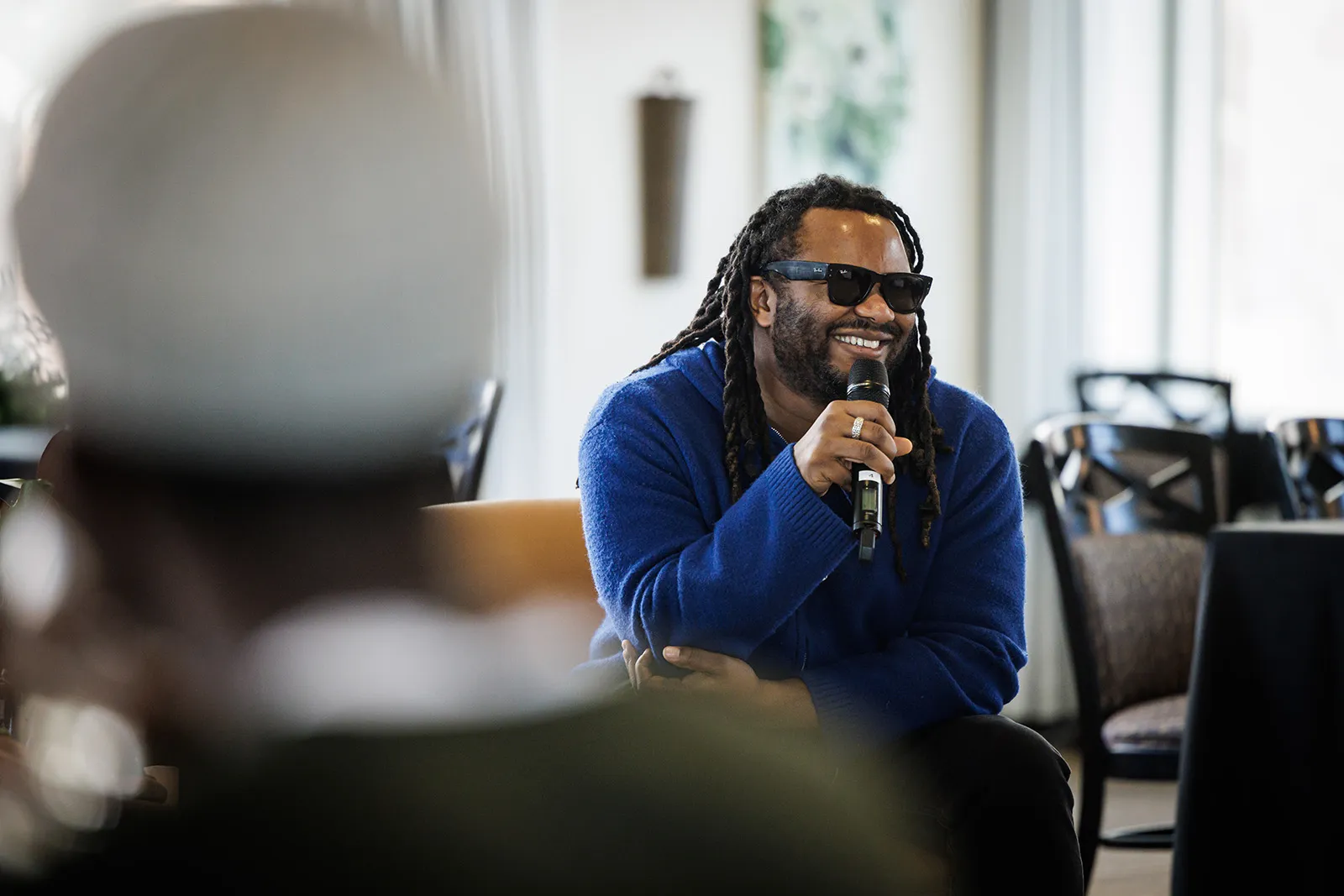 Grammy nominated artist Blessing Offor tells his story to a crowd of people. Blessing lost his vision as a child, while blindness has created numerous challenges for him, Blessing frequently remarks how being blind has blessed his life.