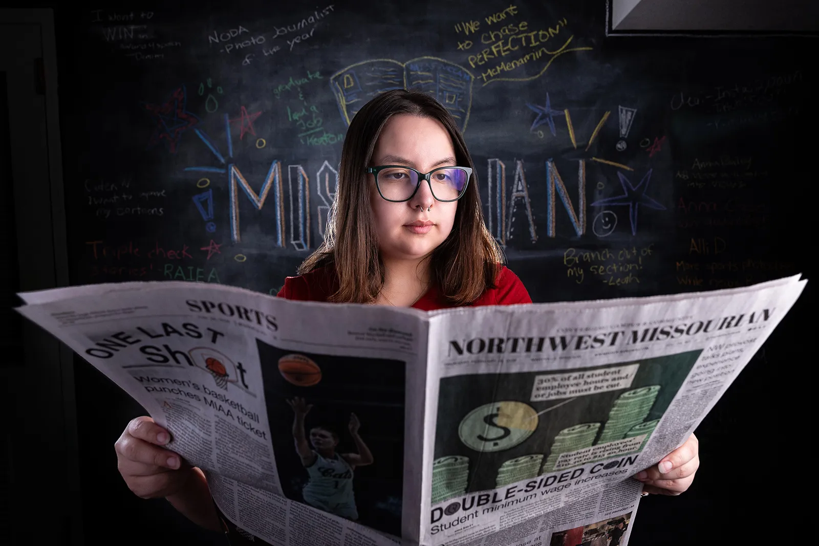 Hannah Claywell, editor-in-chief of the Northwest Missourian student newspaper, reads a copy of the publication in the newsroom.