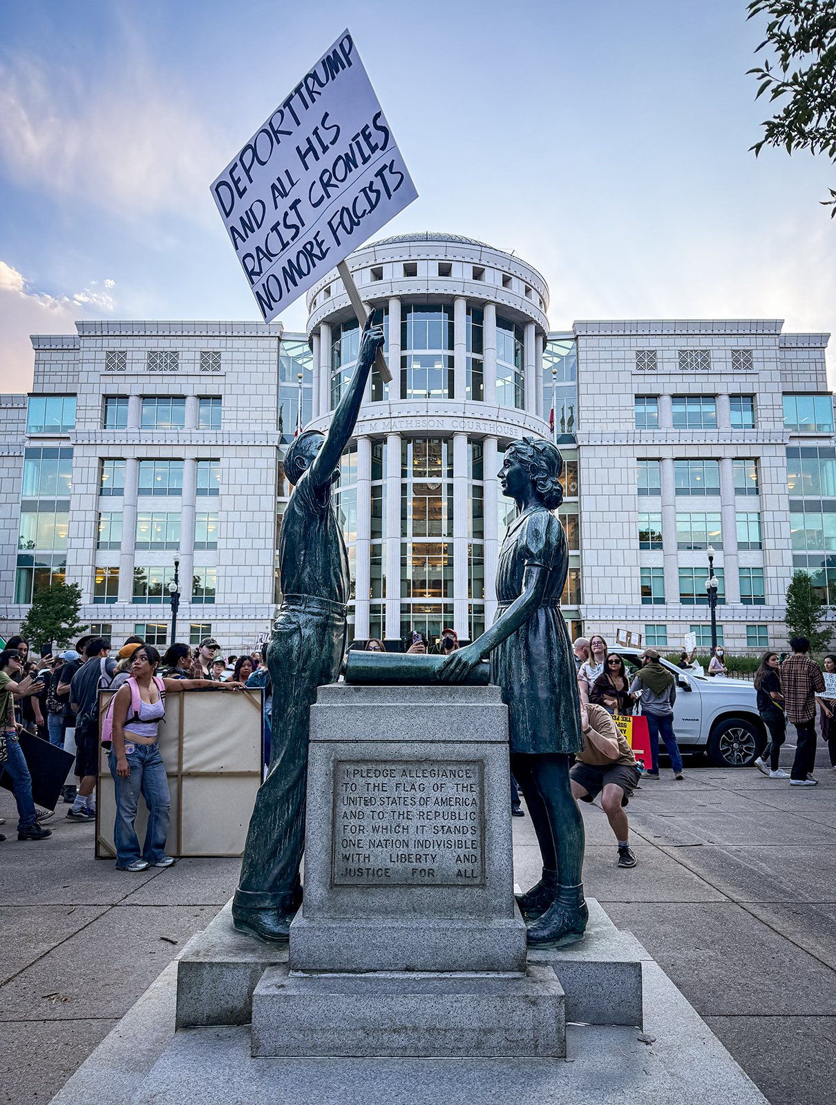 Protesters use a statue, which has the Pledge of Allegiance engraved on it, to hold a sign protesting current government actions.